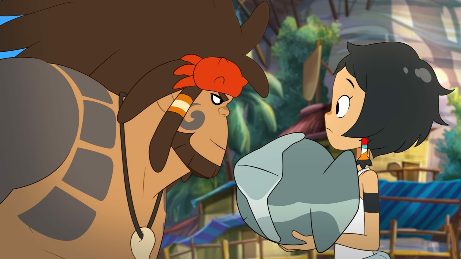 Der Strandputzer-CupMouse' Vater Big Chief Moe (r.) macht Corto ein Geschenk aus der Heimat.Bild: © WDR/2021 Cyber Group Studios