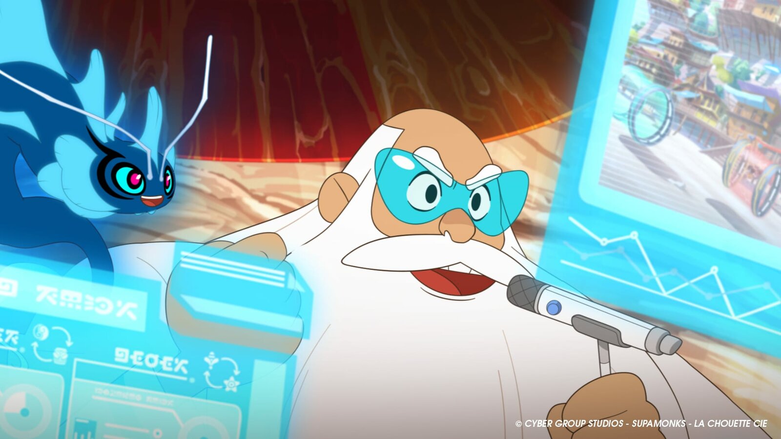 Das Titankrabben-DuellAls Kommentator unterwegs: Rennveranstalter Wyatt Whale mit Genie Neptune (l.)Bild: © WDR/2021 Cyber Group Studios