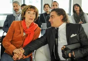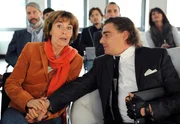 Vier Drillinge sind einer zu vielLinda (Thekla Carola Wied) bittet den exzentrischen Modezar Marius van Boonen (Martin Feifel) um einen Job für ihre Tochter.Bild: © ZDF und ARD Degeto/Kerstin Stelter