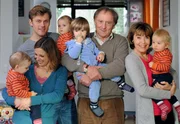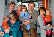 Vier Drillinge sind einer zu vielDa herrscht Leben in der Bude: Linda (Thekla Carola Wied, re.) und Jakob (Günther Maria Halmer, 2.v.r.) mit ihren Kindern Leonie (Julia Brendler) und Thomas (Jens Atzorn), sowie deren Drillingen und dem kleinen Fritz.Bild: © ARD Degeto/Kerstin Stelter