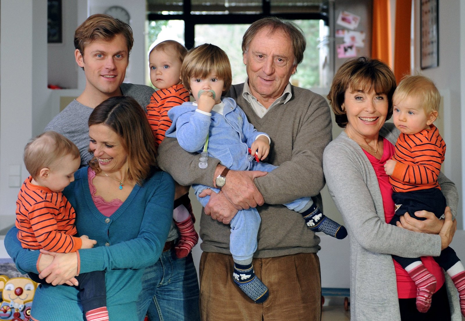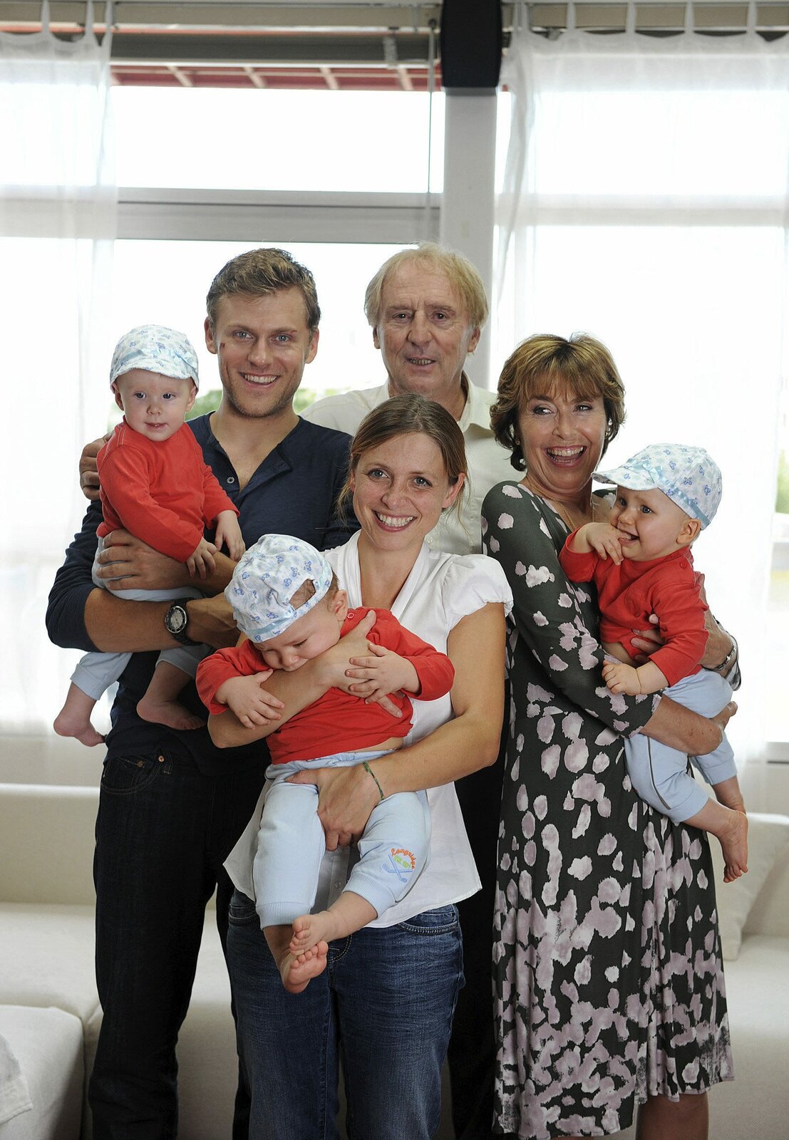 Ein Drilling kommt selten alleinEine sympathische Familie: Die Journalistin Linda Rosenau (Thekla Carola Wied, re.), ihre Tochter Tochter Leonie (Julia Brendler), der Lateinlehrer Jakob Buchmann (Günther Maria Halmer), dessen Sohn Thomas (Jens Atzorn, li.) und die putzigen Drillinge.Bild: © ARD Degeto/Kerstin Stelter