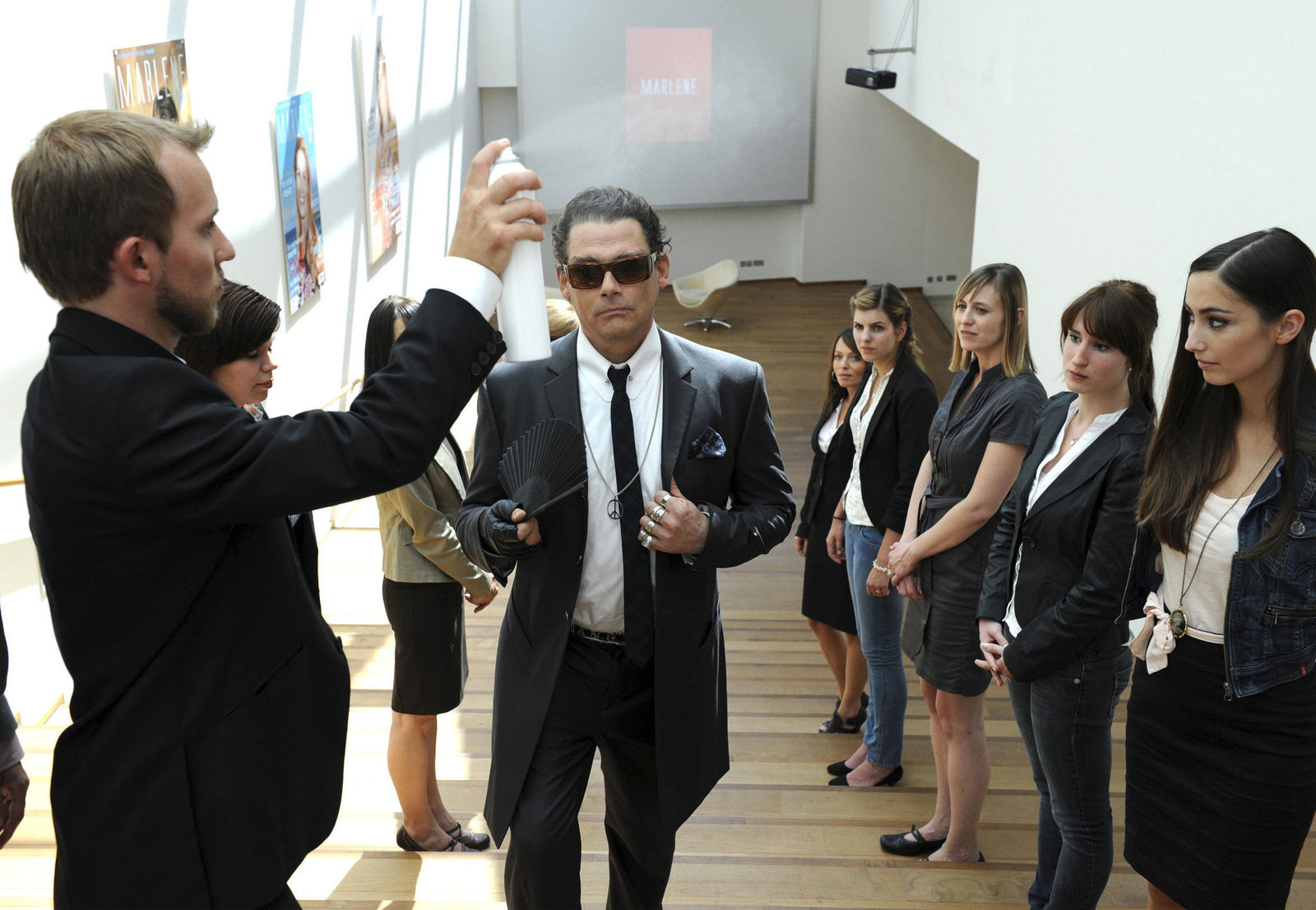 Ein Drilling kommt selten alleinKeine ruhige Minute: Der exzentrische Modezar Marius van Boonen (Martin Feifel, Mitte) auf dem Weg zu einem Interview-Termin.Bild: © ARD Degeto/BR/Kerstin Stelter / Kerstin Stelter