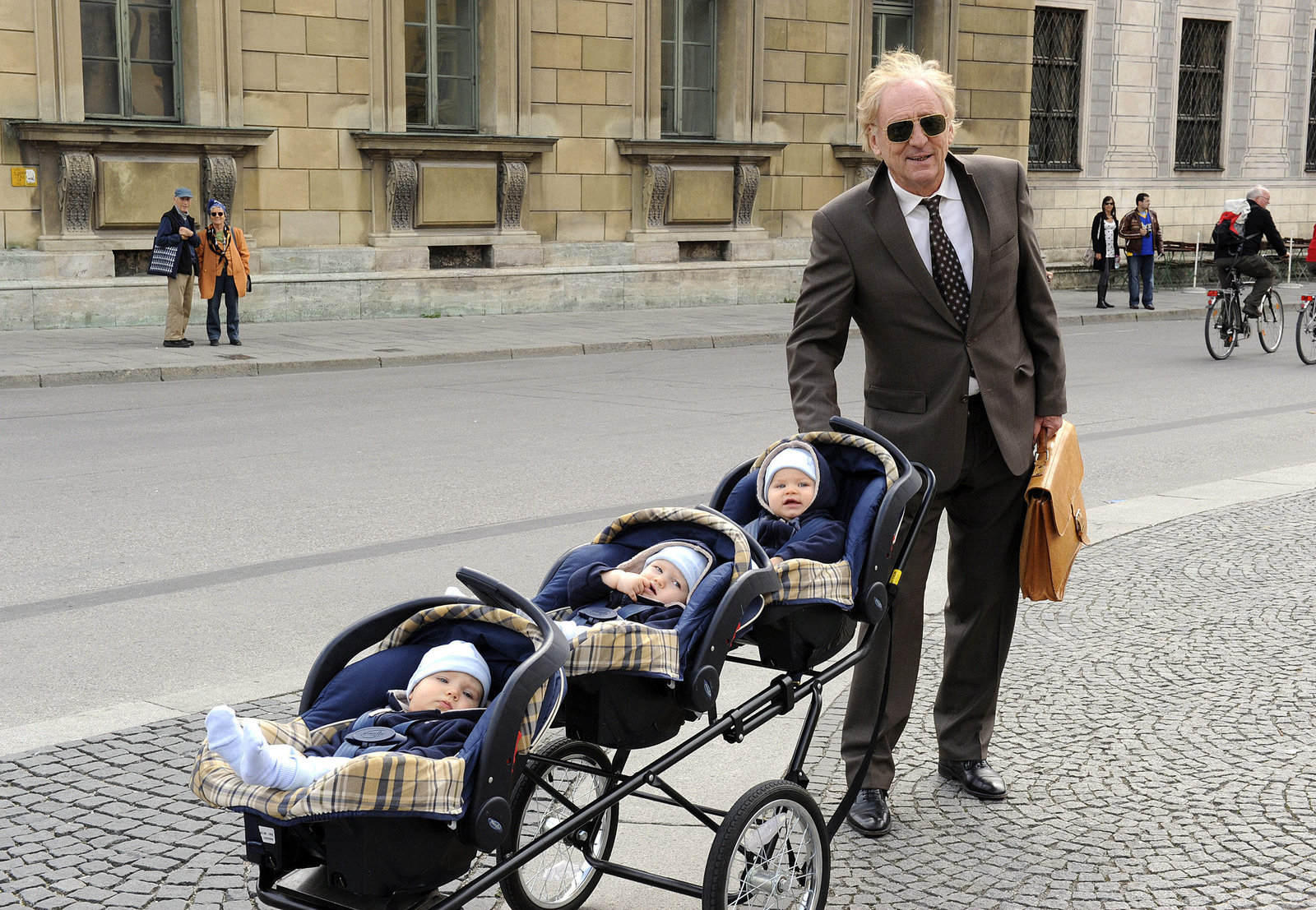 Ein Drilling kommt selten alleinEin ungewohntes Bild: Der konservative Lateinlehrer und Menschenfeind Jakob Buchmann (Günther Maria Halmer) ist mit drei Babies unterwegs.Bild: © MDR/Degeto/Kerstin Stelter