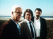 Tod auf BewährungAuf der Reise in die Vergangenheit führen Jonathan (Michael Landon, M.) und Mark (Victor French, r.) den Unternehmer Benson (Leslie Nielsen, l.) an die Schauplätze seiner Untaten.Bild: © ProSieben Media AG © Worldvision Enterprises, Inc.