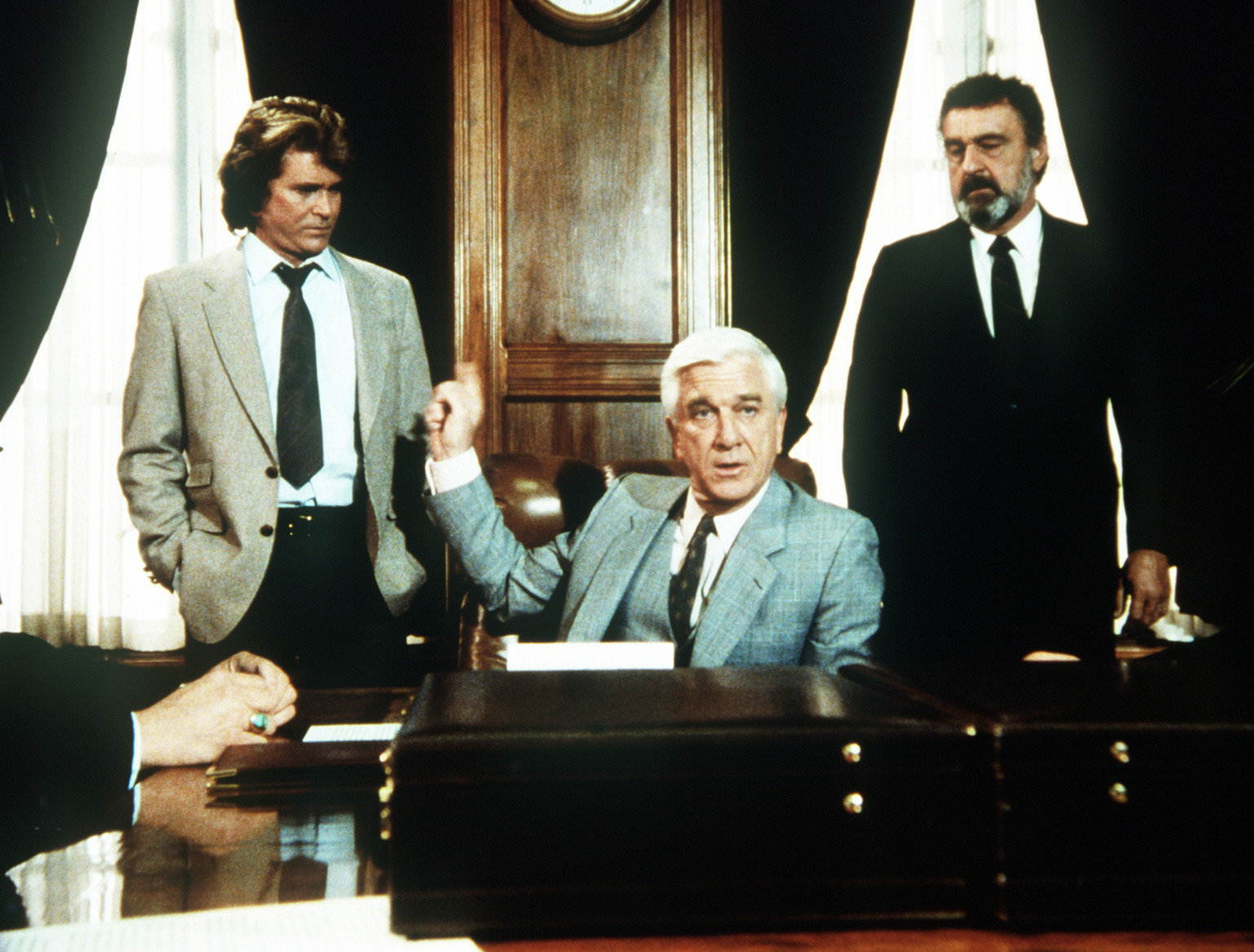 Tod auf BewährungJonathan (Michael Landon, l.) und Mark (Victor French, r.) nehmen als Mr. Bensons (Leslie Nielsen, M.) Leibwächter an einer Aufsichtsratssitzung teil.Bild: © ProSieben Media AG © Worldvision Enterprises, Inc.