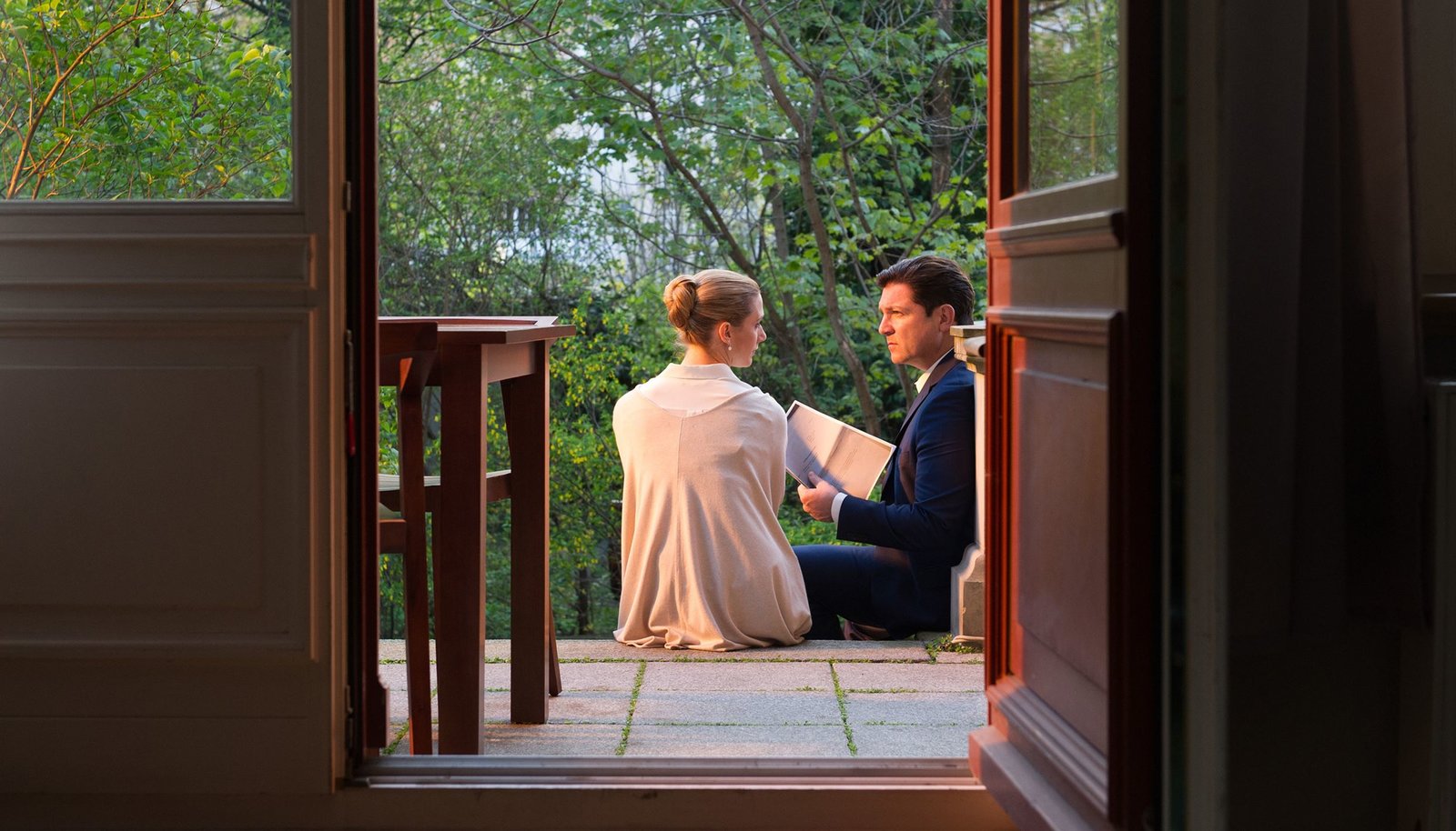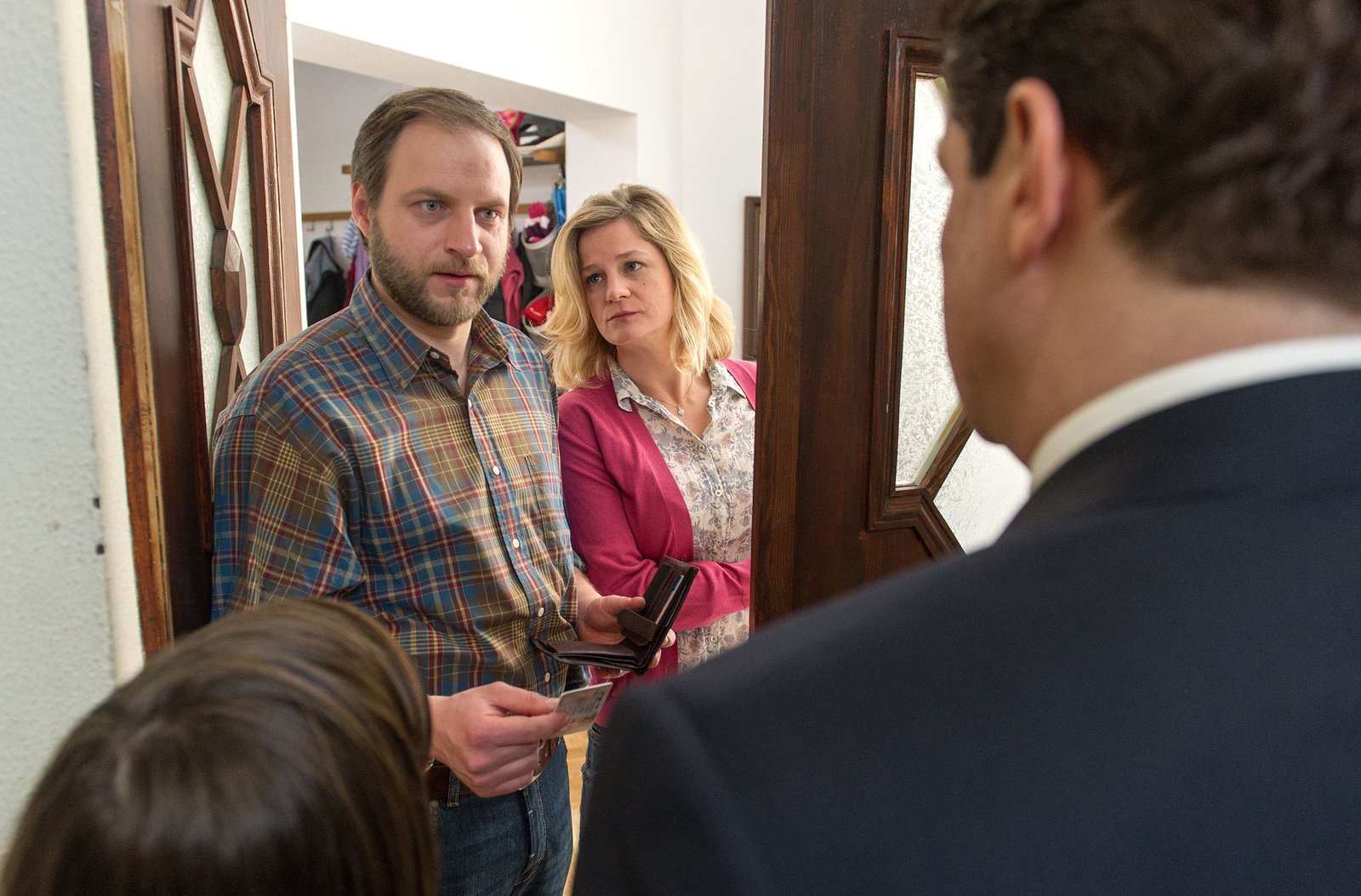 HeimwehStaatsanwalt Thomas Bachmann (Holger Handtke, r.) informiert Eva Sternberg (Kristin Meyer, l.), dass sich ihr Mann Florian in der Gewalt eines Juwelenräubers befindet.Bild: © ARD