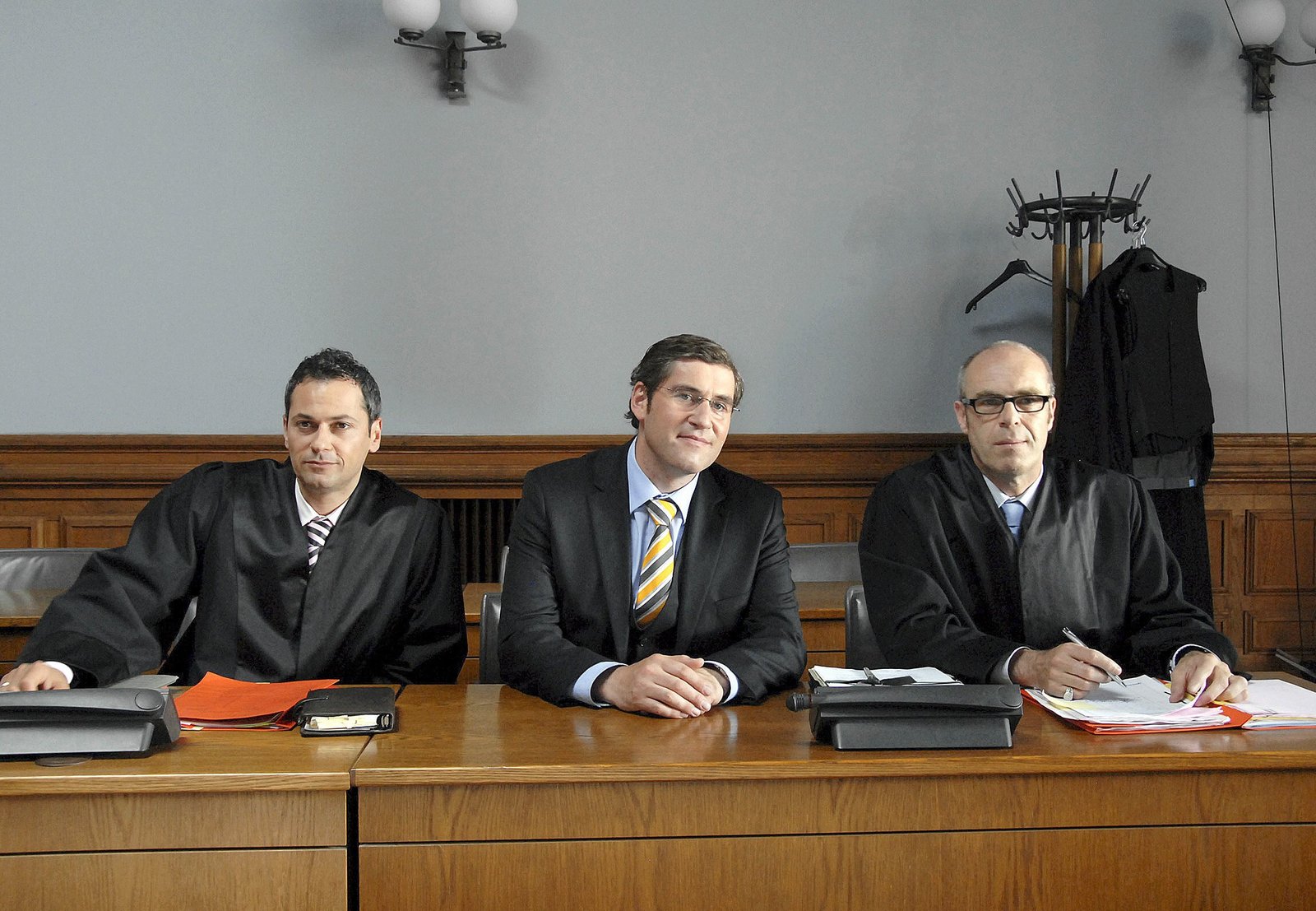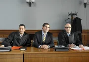 SaubermännerFlankiert von seinen Anwälten Braun (Peter Kremer, rechts) und Rigas (Vassily Kazakos, links) gibt der angeklagte Bürgermeisterkandidat René Tornow (Stephan Szasz) sich siegesgewiss.Bild: © "ARD Degeto/ARD Degeto/Susan R. Skelton" (S2)