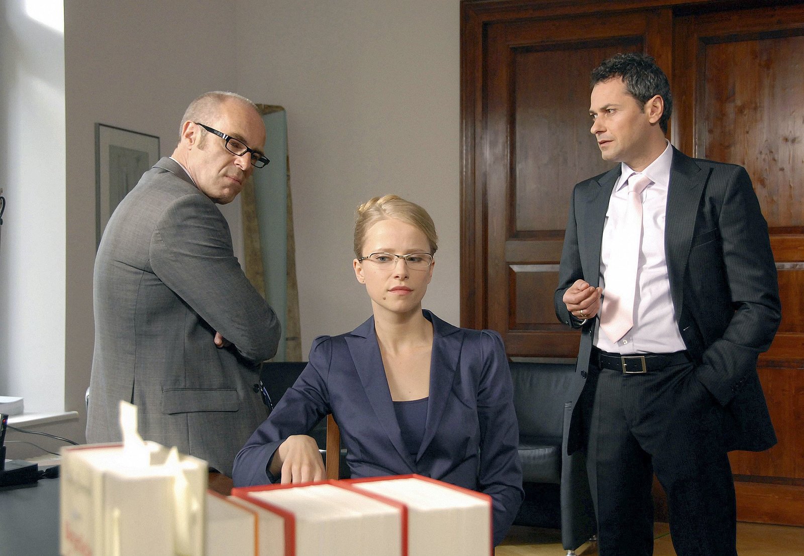 FamilienfotoARD EIN FALL VON LIEBE, neue Vorabendserie (8 Folgen), Folge 7 "Familienfoto", am Donnerstag (11.12.14) um 18.50 Uhr im Ersten. Alles im Griff? Eva Sternberg (Kristin Meyer, M.) mit ihrem Mann Florian Faber (Francis Fulton-Smith, l.) und ihrem Vater Hans Sternberg (Peer Jäger, r.) in der Kanzlei.Bild: © ARD