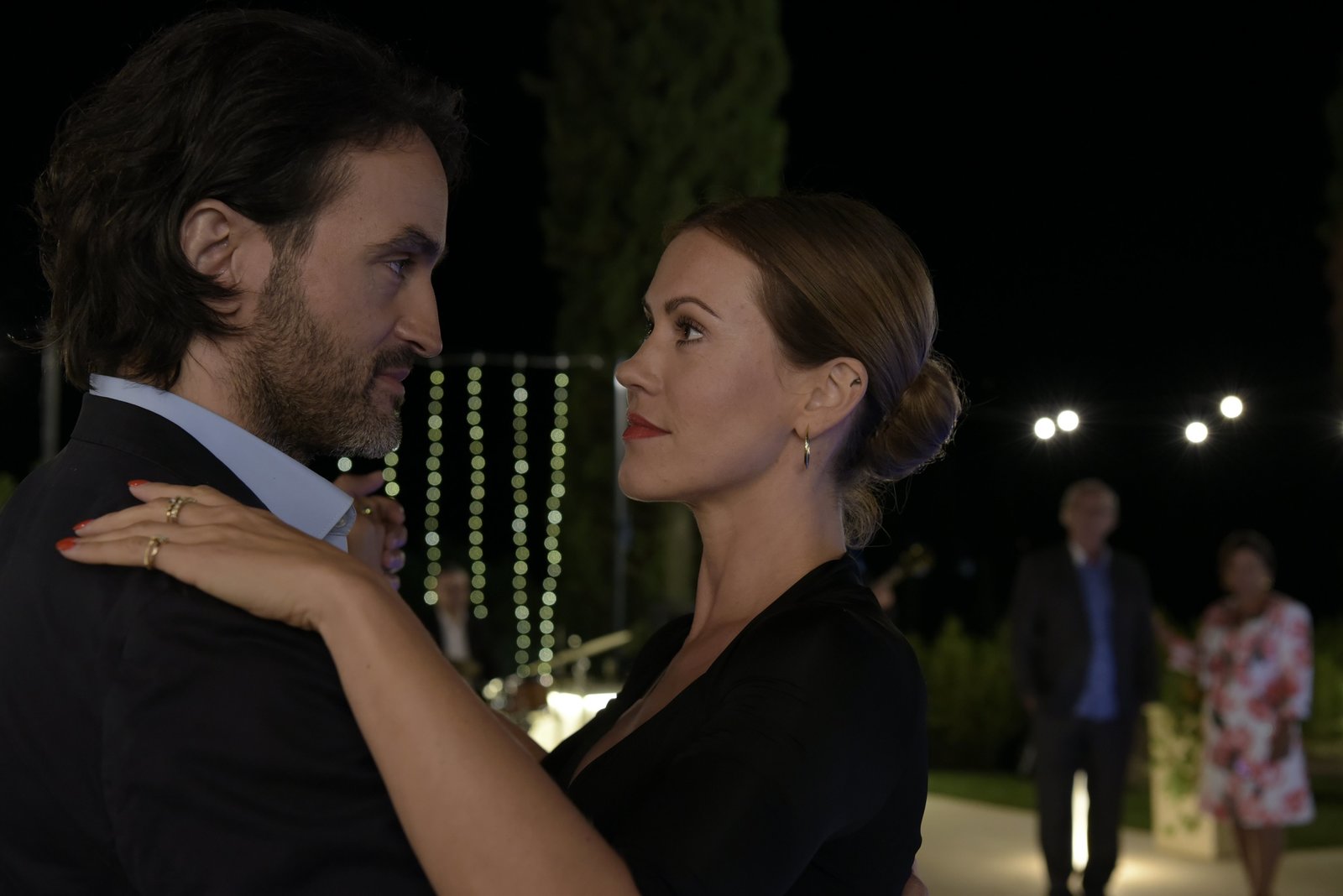 Ein Sommer in der ToskanaLaura (Wolke Hegenbarth) und Alessandro (Kerem Can) halten noch Distanz, finden sich aber sympathisch. Emanuele (Rolf Sarkis) beobachtet das Ganze skeptisch aus dem Hintergrund, während sich seine Frau Elisa (Susanna Capurso) für ihren Sohn freut.Bild: © ZDF und Christiane Pausch.