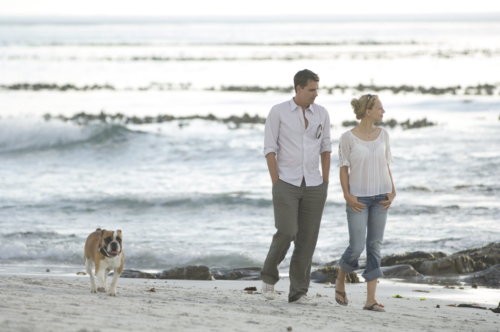 Ein Sommer in Long IslandHolly (Petra Schmidt-Schaller), ihr Hund Hudson (Bruno) und Ben (Max von Thun) genießen einen gemeinsamen Tag am Strand.Bild: © ZDF und David Bloomer