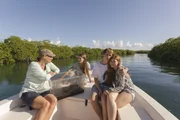 Ein Sommer in FloridaGemeinsam mit ihren Zwillingen und Nils' Freundin Lucy fährt Henriette durch die Mangroven Floridas zum offenen Meer, um die Schildkröte Loreley auszuwildern (v.l.n.r. Suzanne von Borsody, Anna Bullard-Werner, Matti Schmidt-Schaller, Taisha Roman).Bild: © ZDF/Kenneth Rexach