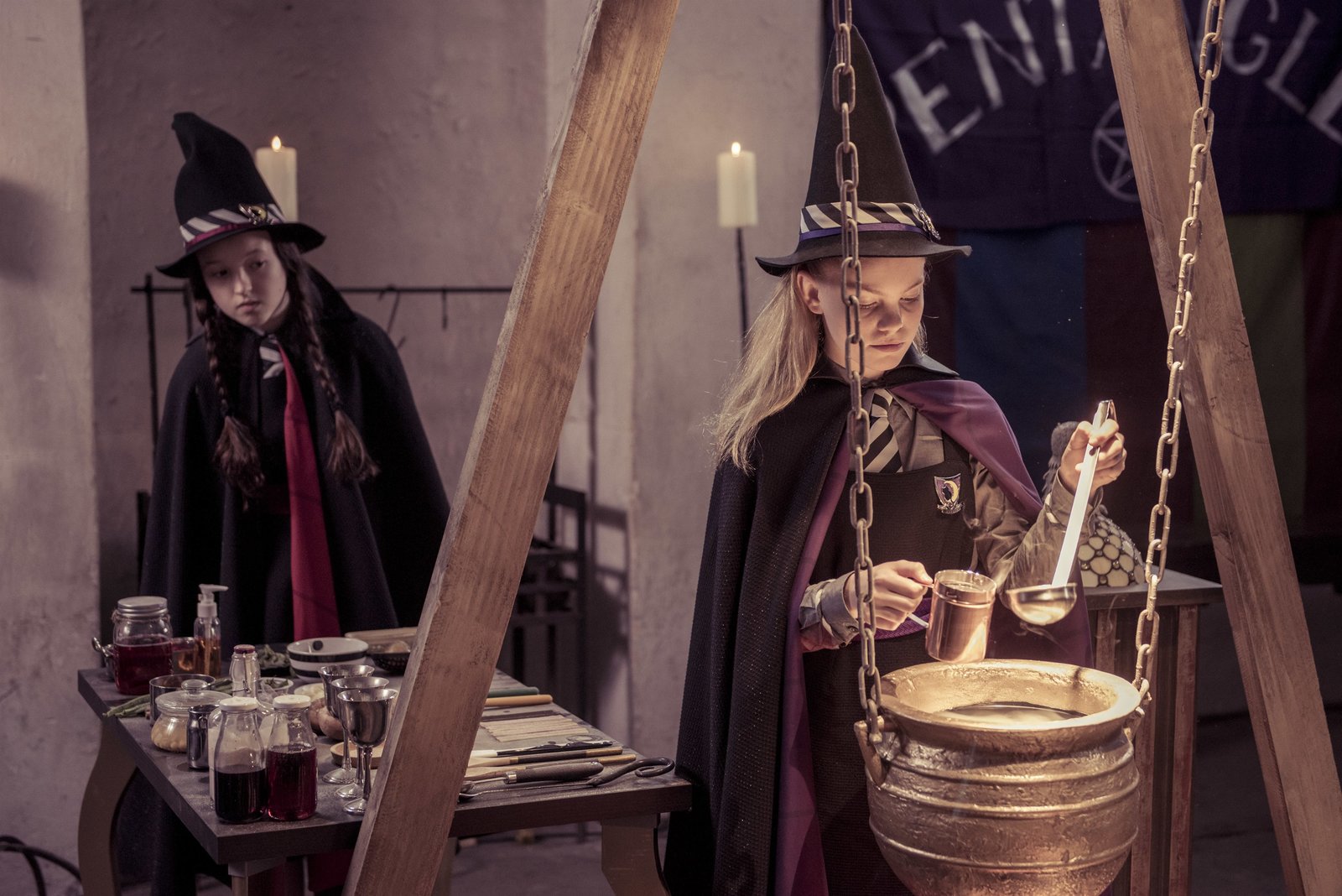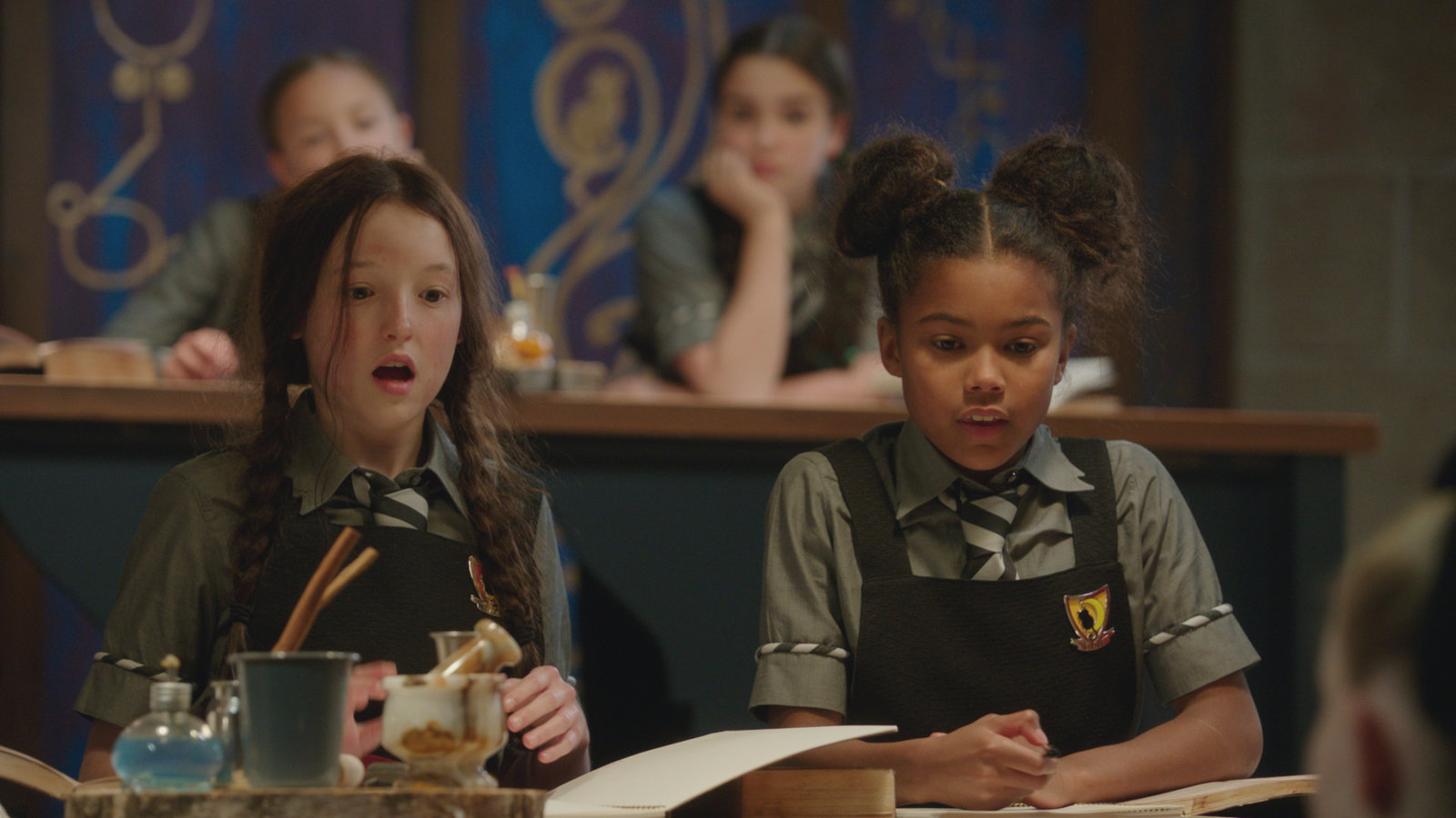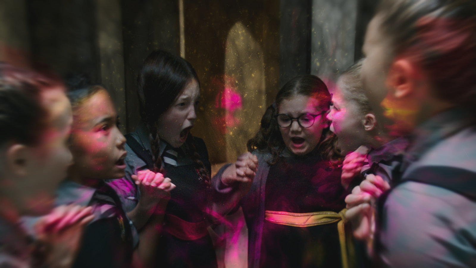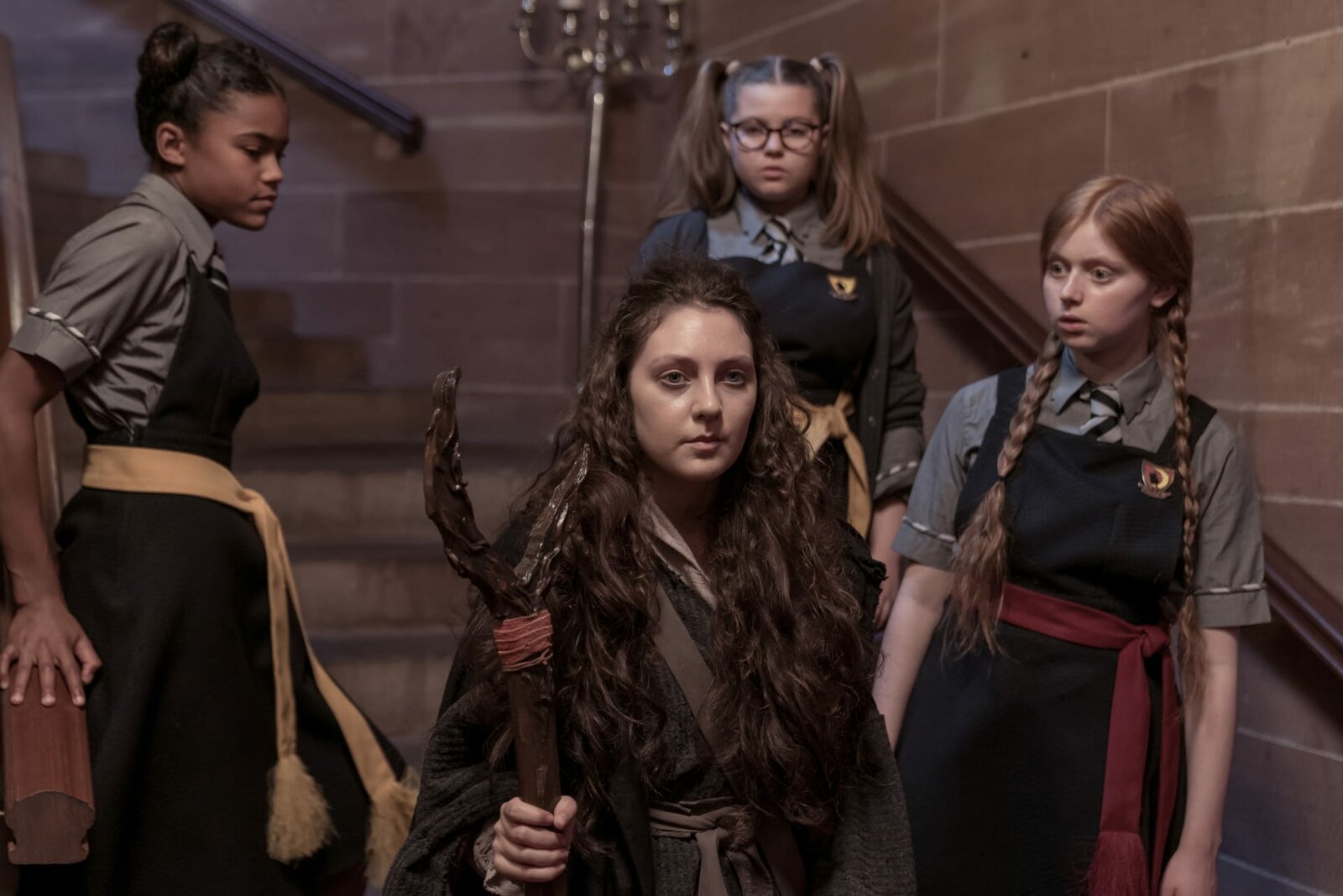 Gemeinsam sind wir starkMildred (Bella Ramsey, 3.v.l.) und ihre Mitschülerinnen können das Rätsel des Hexenzirkels nur gemeinsam lösen. Zusammen sagen sie den passenden Zauberspruch.Bild: © ZDF und x