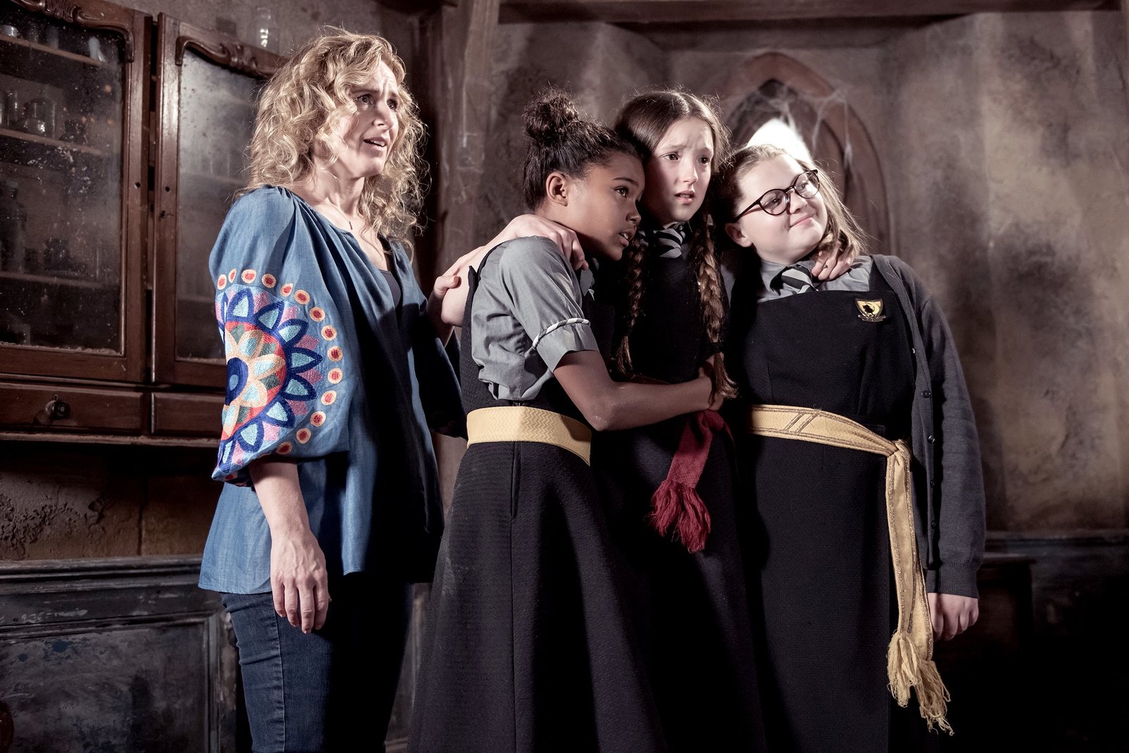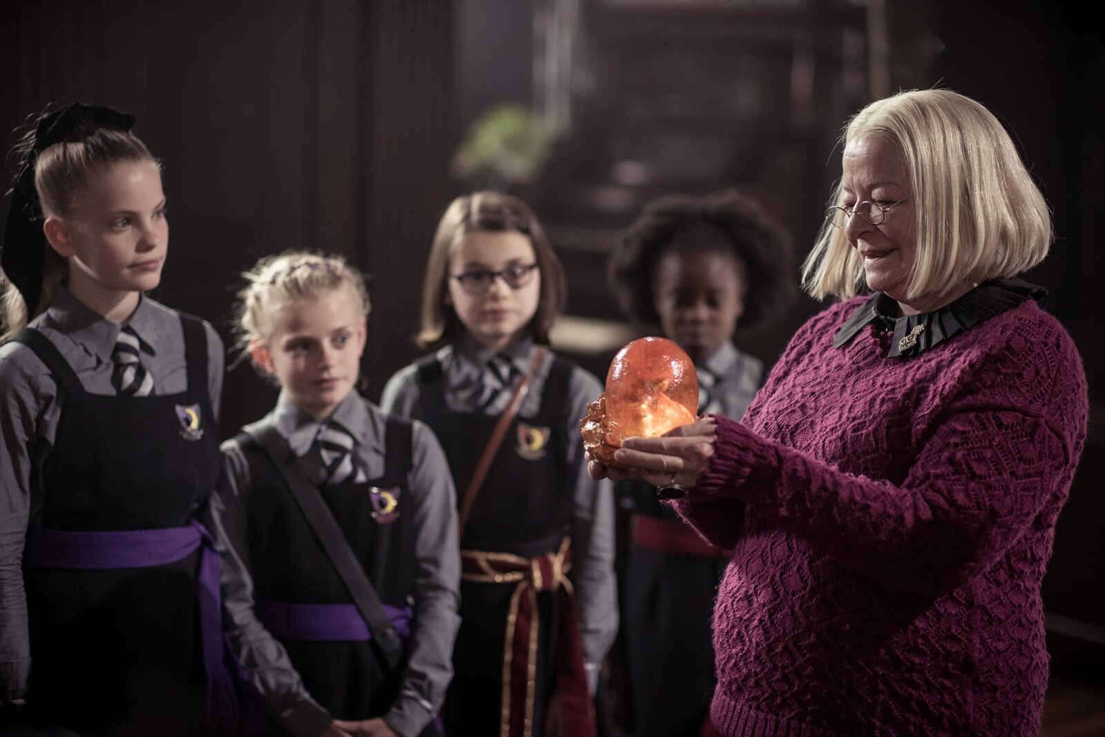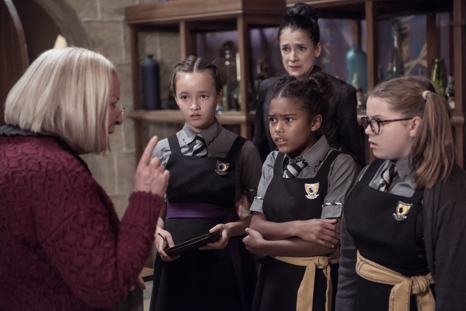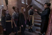 Die Magie spielt verrücktFrau Harschmann (Raquel Cassidy, hinten) weiß wie ernst die Lage auf Graustein ist. Frau Graustein, die Direktorin (Clare Higgins, l.), möchte, dass die drei Mädchen Felicitas, Edith und Maude (Dagny Rollins, Tamara Smart und Megan Hughes, v. l. n. r.) sofort das Schulgebäude verlassen.Bild: © ZDF und James Stack.