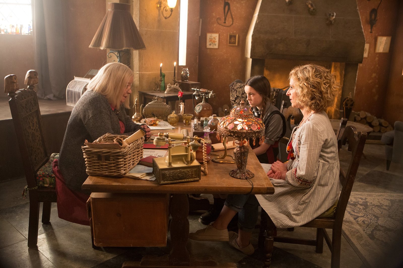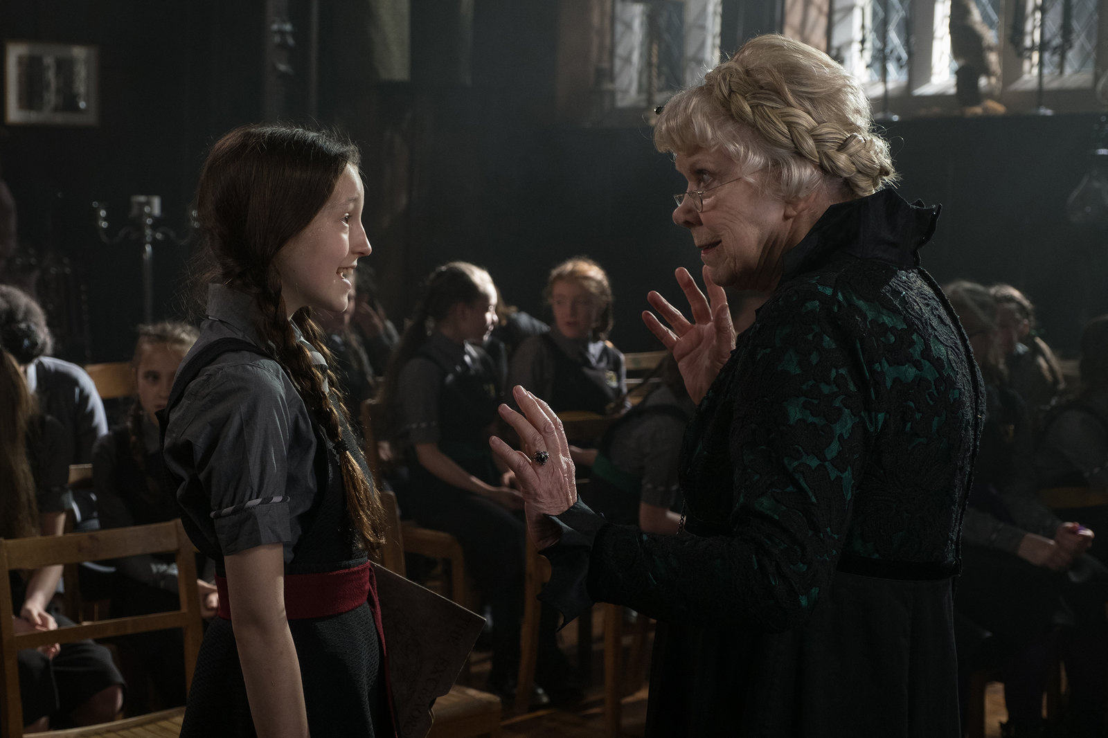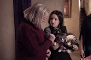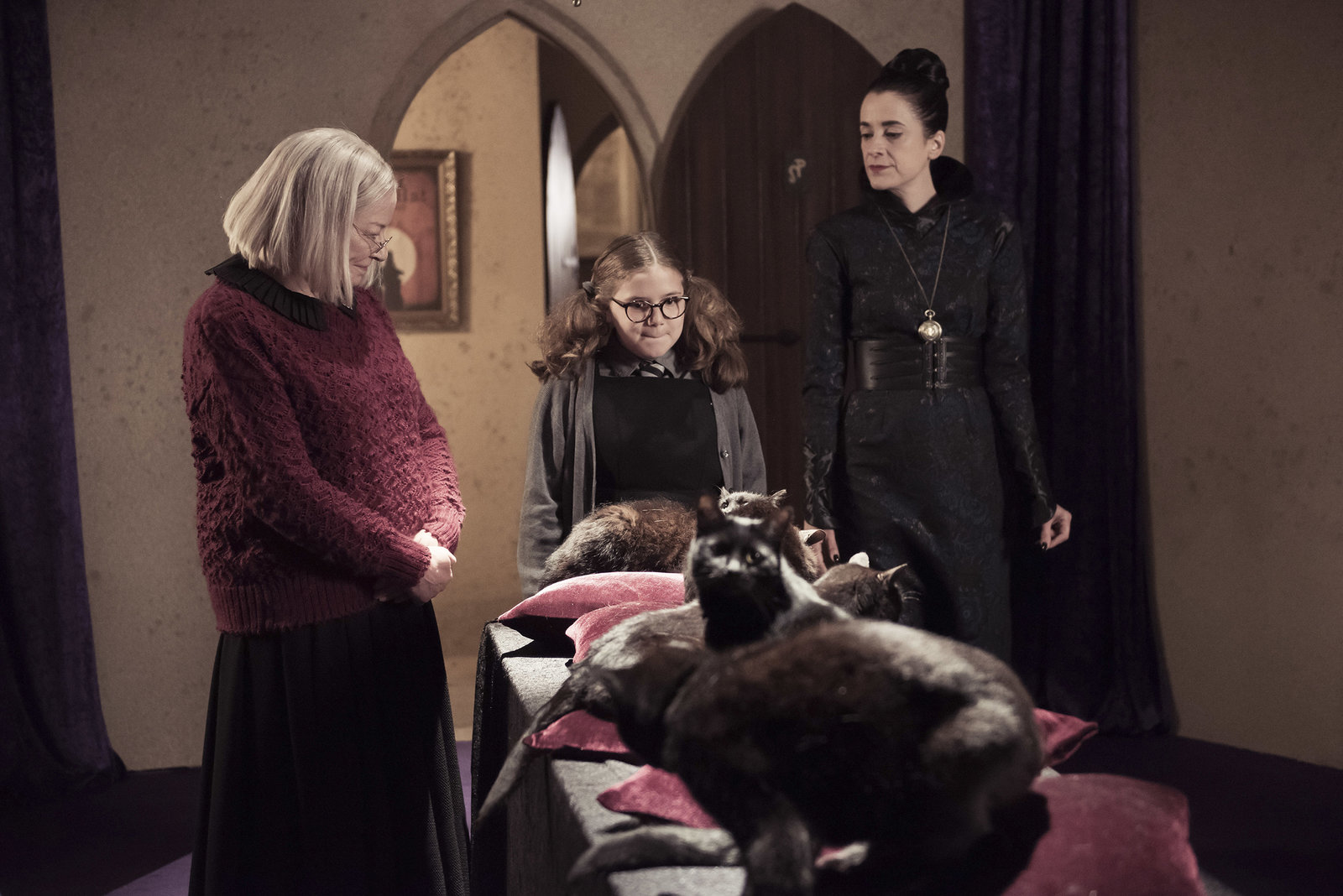 Die Magie spielt verrücktFrau Harschmann (Raquel Cassidy, hinten) weiß wie ernst die Lage auf Graustein ist. Frau Graustein, die Direktorin (Clare Higgins, l.), möchte, dass die drei Mädchen Felicitas, Edith und Maude (Dagny Rollins, Tamara Smart und Megan Hughes, v. l. n. r.) sofort das Schulgebäude verlassen.Bild: © ZDF und James Stack.