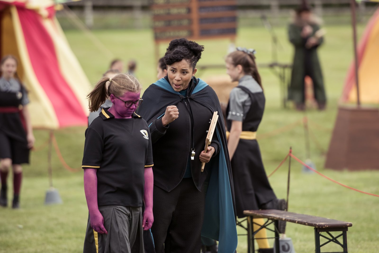 Mildreds StammbaumFrau Drill (Shauna Shim) baut Maude (Megan Hughes) auf. Sie motiviert sie, sich den sportlichen Wettkämpfen mutig zu stellen.Bild: © ZDF und James Stack.