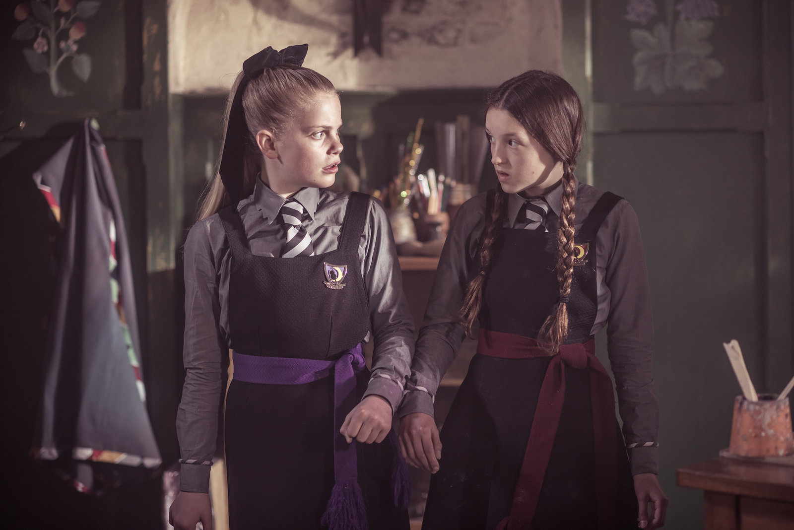 Die FreundschaftsfalleEsther (Jenny Richardson, l.) und Mildred (Bella Ramsey, r.) sind durch einen Freundschaftszauber an ihren Unterarmen fest miteinander verbunden. Nun müssen sie alles gemeinsam machen. Der Zauber löst sich erst auf, wenn sie nett miteinander umgehen.ÂBild: © ZDF/James Stack