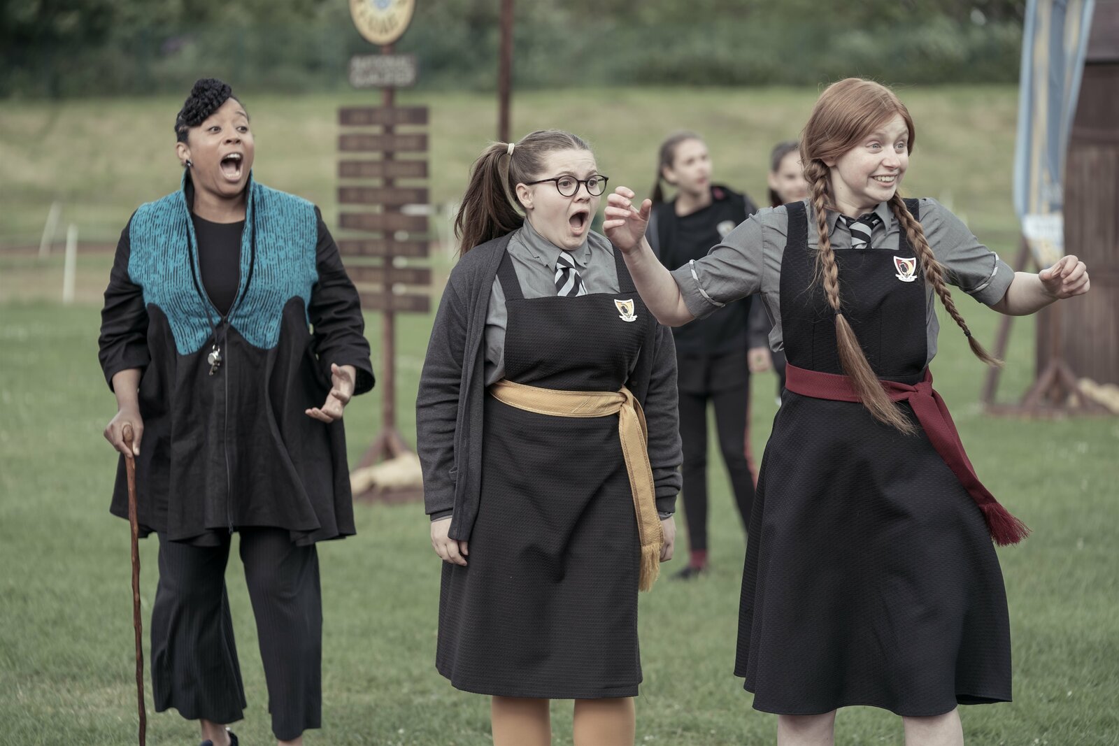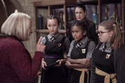 Frau Harschmann (Raquel Cassidy, re.) kann schlecht zeigen, dass sie sich freut, dass Mildred (Lydia Page, li.) wieder zurück auf Graustein ist. Azura (Luciana Akpobaro, h.li.) und ihre Freundin Izzy (Saoirse Addison) haben Mildred bereits darüber informiert, dass sich Agatha - die böse Zwillingsschwester von Ada Graustein - mit Esthers Hilfe aus dem Foto befreien konnte und nun auf Graustein herrscht.Bild: © ZDF/Rachel Joseph