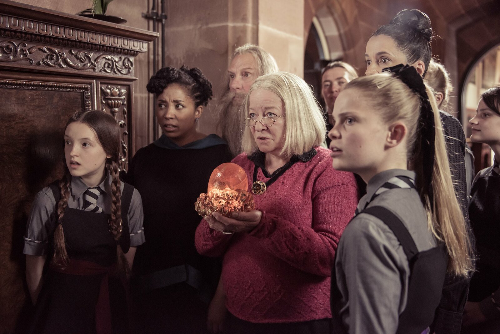 Zwillingszauber (2)Die Direktorin Frau Graustein (Clare Higgins, M.) präsentiert den Schülern und Lehrern den energiegeladenen Grundstein. Er ist für all die magische Kraft innerhalb der Schule verantwortlich.Bild: © ZDF/James Stack