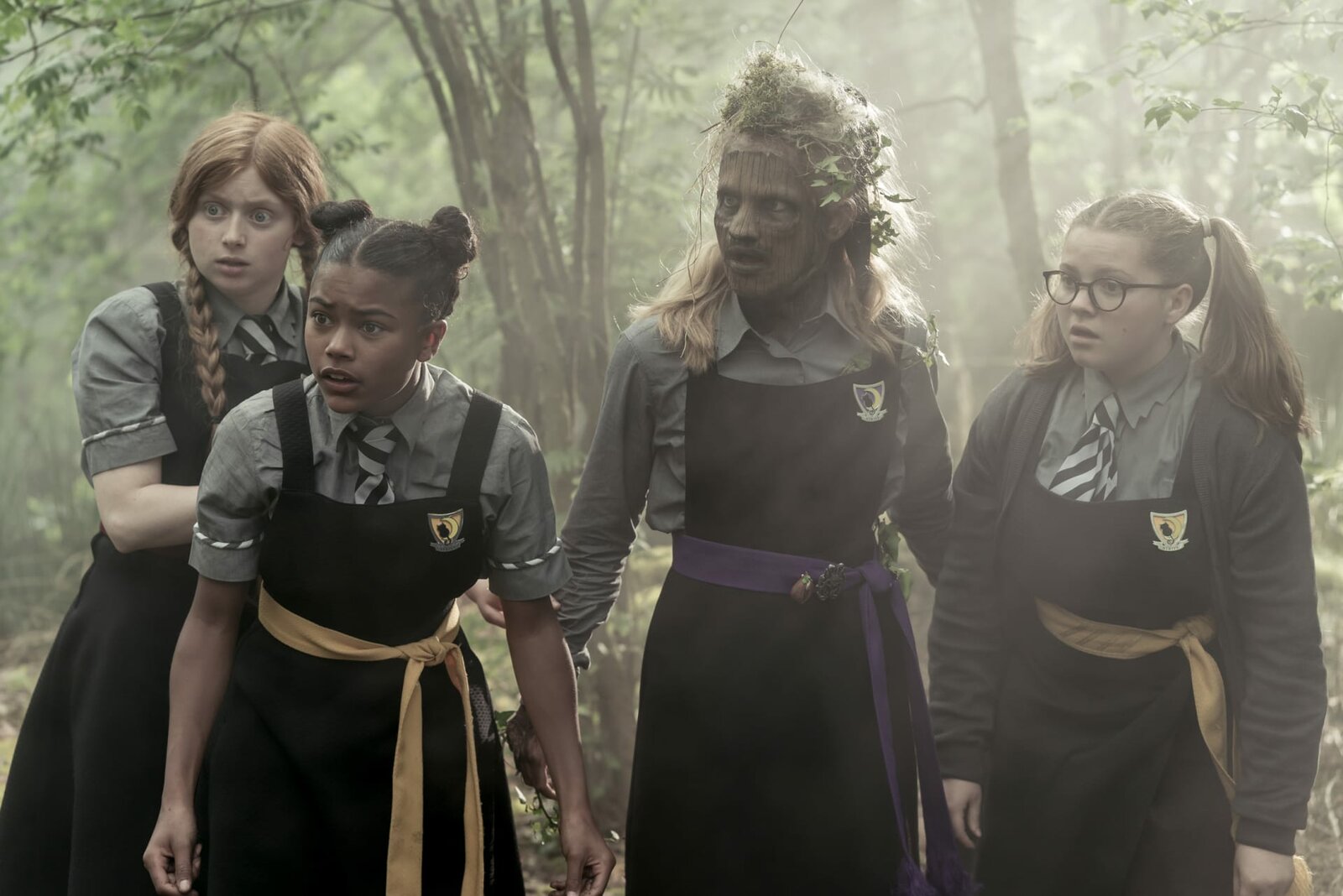 Grüne HexenUm das Natur-Freundin-Abzeichen zu erlangen, hat Esther (Jenny Richardson, 2.v.r.) einen alten magischen Baum zerstört. Nun verwandelt sie sich langsam selbst in einen Baum. Mildred (Lydia Page, l.), Edith (Tamara Smart, 2.v.l.) und Maude (Megan Hughes, r.) wollen ihr helfen, den Zauber zu stoppen. Dafür muss Esther sich bei dem Baum aus tiefer Überzeugung entschuldigen. Ob sie ihre "grüne Seite" noch rechtzeitig entdeckt.Bild: © ZDF/James Stack