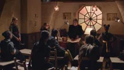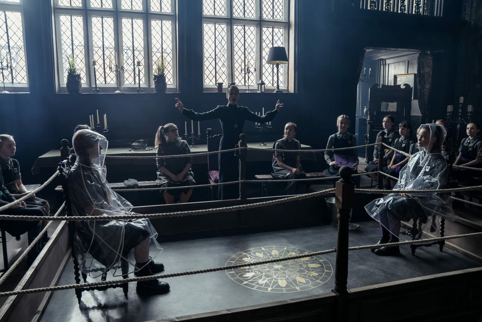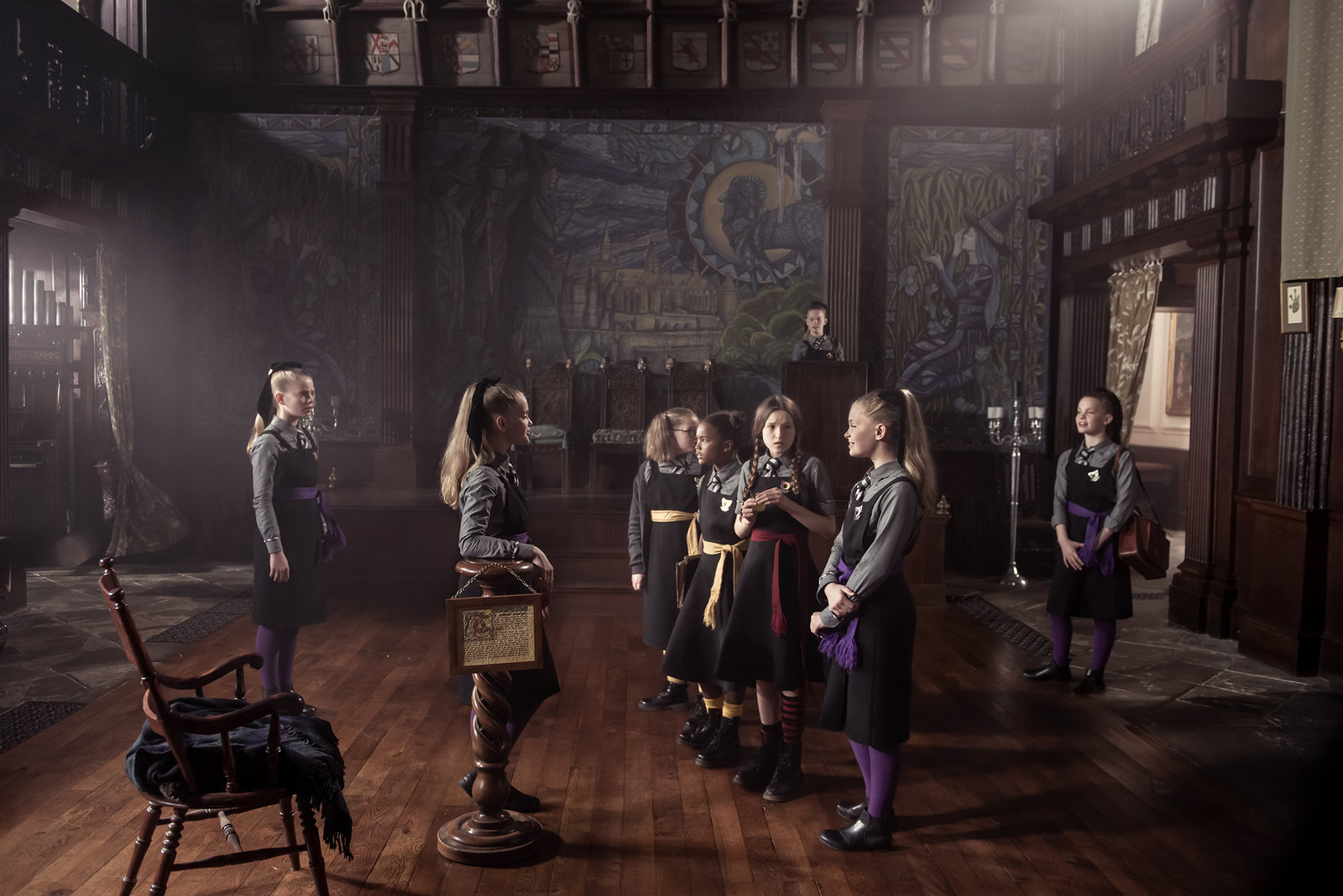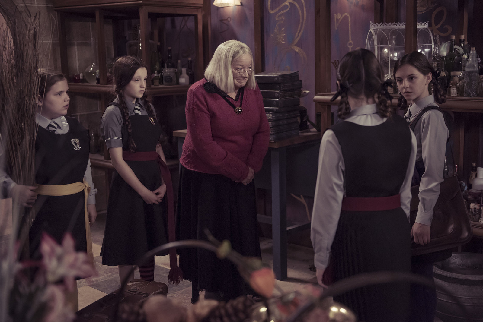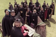 Die Entscheidung des ZauberratesMildred (Bella Ramsey, 2. v. r.), Maude (Megan Hughes, r.) und Edith (Tamara Smart, 2. v. l.) sind Frau Graustein (Clare Higgins, r.) zur Sitzung des Zauberrates gefolgt. Ob die Mädchen sich dort Gehör verschaffen und verhindern können, dass ihre Direktorin die Akademie verlassen muss?ÂBild: © ZDF/James Stack