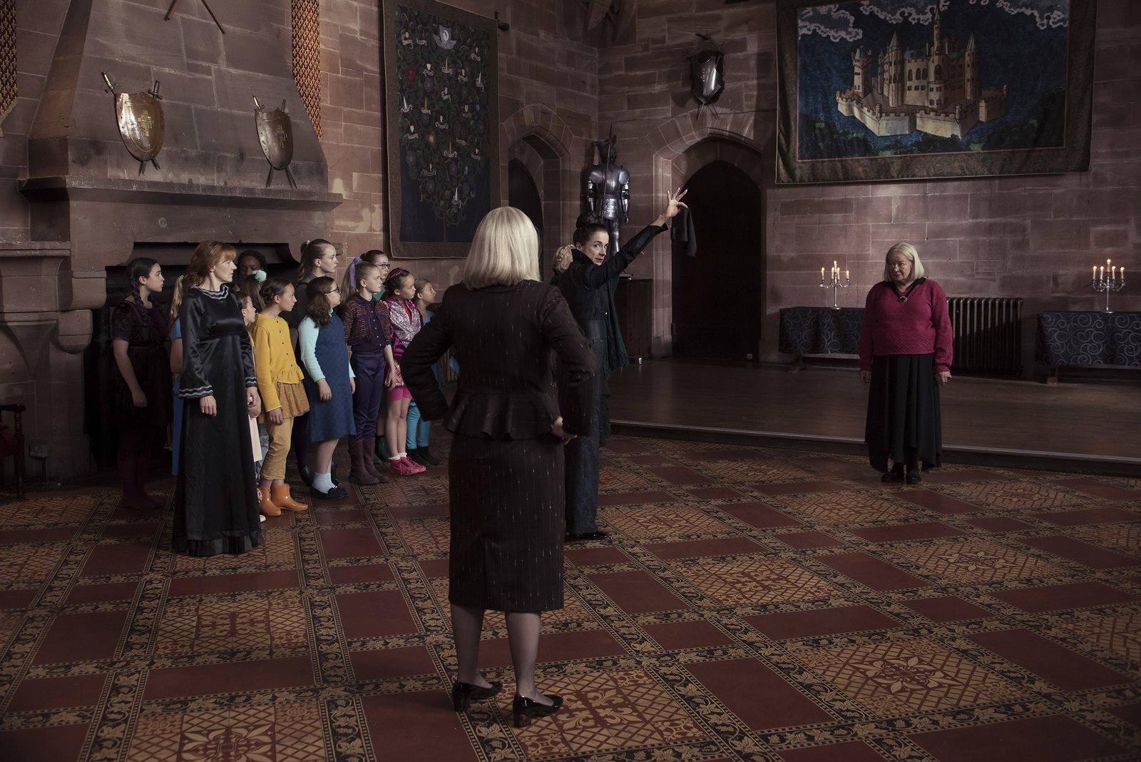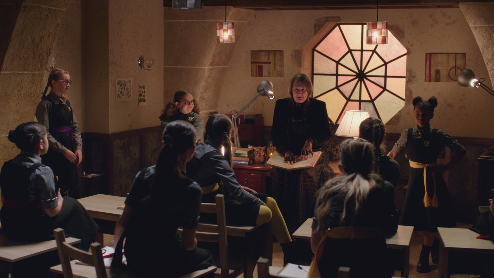 Indigos GeburtstagFrau Harschmann (Raquel Cassidy, M.) eröffnet den Debatten-Wettstreit. Die Zuschauer-Mädchen blicken gespannt zu Mildred (Lydia Page, l.) und Esther (Jenny Richardson, r.), die im Ring sitzen. Ihr Debattier-Thema ist "Macht die Magie, einen zu etwas Besonderem, oder nicht?". Esther debattiert dafür, Mildred dagegen.Bild: © ZDF/James Stack