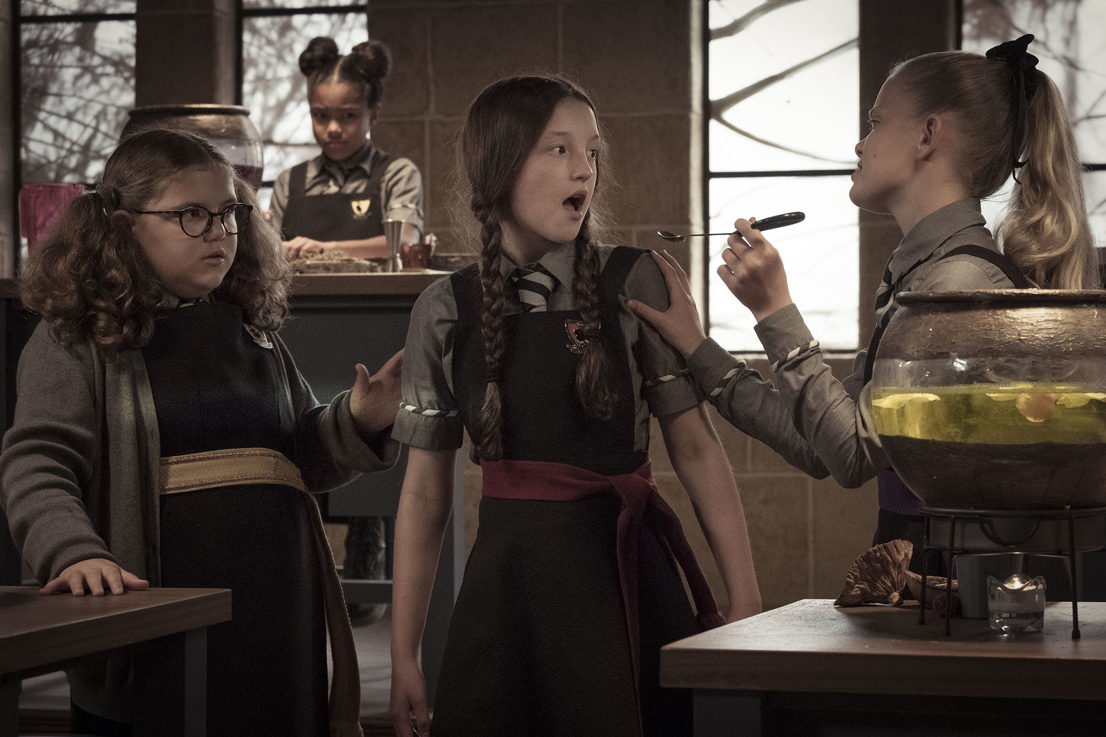 Ein turbulenter GeburtstagFrau Graustein hat Geburtstag. Am Abend auf dem Überraschungsfest bieten die drei Freundinnen - Edith (Tamara Smart), Maude (Megan Hughes) und Mildred (Bella Ramsey) - eine Aufführung dar.Bild: © ZDF und James Stack.