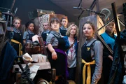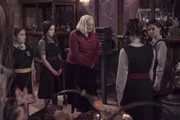 Magische MutterDie drei Freundinnen - Beatrix (Ynez Williams, 3.v.r.), Sybille (Trixie Hyde, 2.v.r.) und Clarissa (Kitty Slack, r.) - freuen sich mit Frau Tapioka (Zita Sattar, M.): Frau Graustein (Clare Higgins, l.) hat Mabel (Annette Hannah, 2.v.l.), Frau Tapiokas Tochter, an die Akademie gezaubert. Mabel wird nun hier zur Schule gehen.Bild: © ZDF/Danielle Baguley