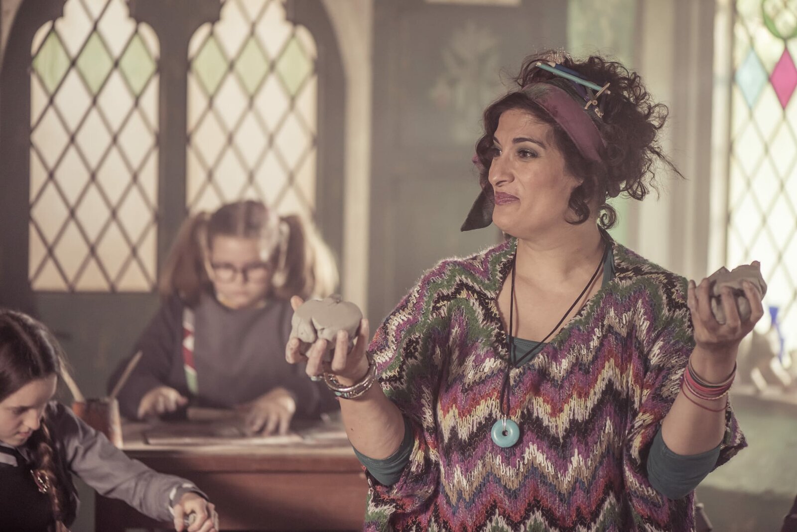 Die FreundschaftsfalleDie neue Kunstlehrerin Frau Schimmel (Mina Anwar) fällt an der Akademie auf. Sie ist bunt gekleidet und macht lockeren kreativen Unterricht. Mildred (Bella Ramsey, l.) gefällt das.Bild: © ZDF/James Stack