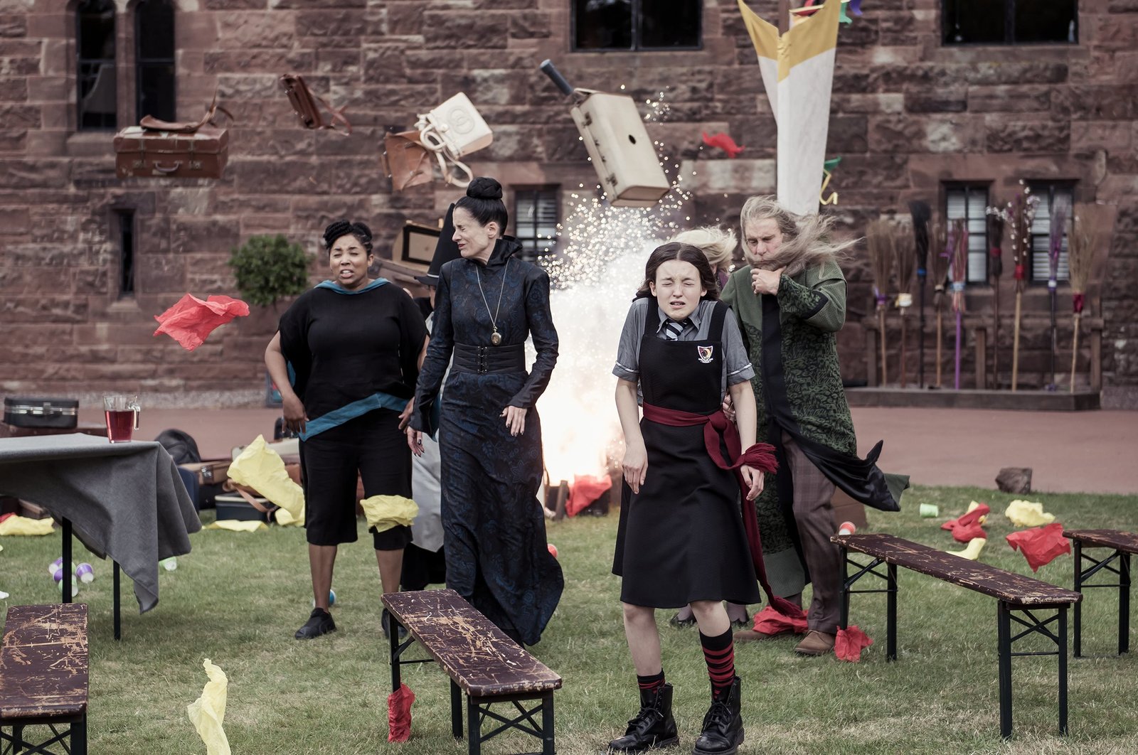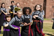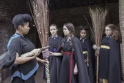 Der große MagierMildred (Bella Ramsey, M.) kann es kaum fassen: Frau Drill (Shauna Shim, l.) möchte, dass sie als Anführerin bei der Besenflugschau fliegt. Die Freundinnen Felicitas (Dagny Rollins, 2.v.l.), Edith (Tamara Smart, 2.v.r.) und Maude Meibh Campbell, r.) sind auch erstaunt.Bild: © ZDF und Rachel Joseph (c) BBC/ZDF Enterprises