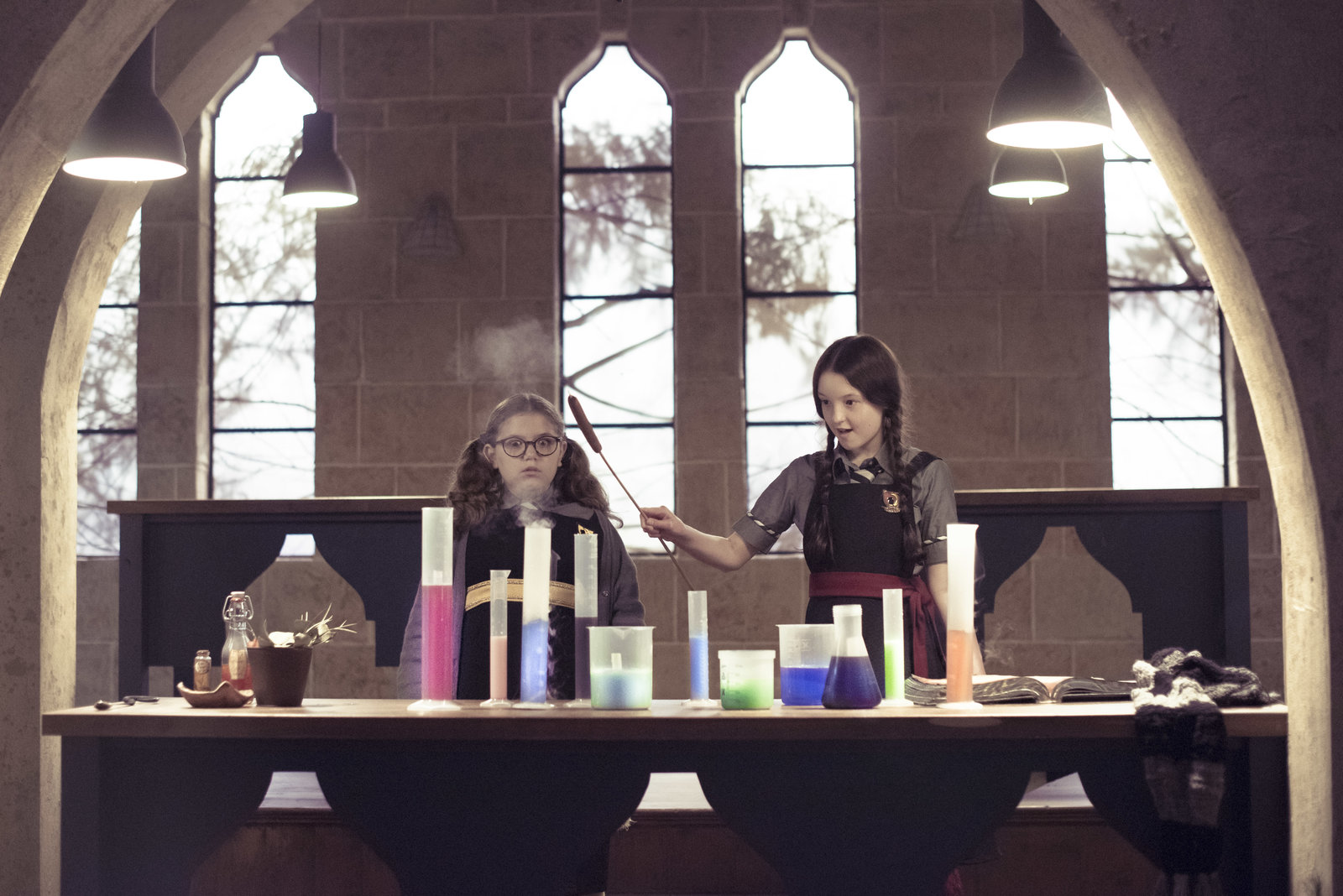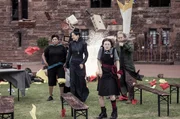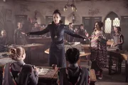 Ruhm und RacheDas Schuljahr ist zu Ende und eigentlich wollen heute alle abreisen, doch ein Sturm zieht auf, der Himmel verdüstert sich und Indigo Mond taucht in den Wolken auf. Sie lässt Energieblitze neben Frau Drill (Shauna Shim, l.), Frau Harschmann (Raquel Cassidy, 2.v.l.), Mildred (Bella Ramsey, 2.v.r.) und Herrn Braunweber (Philip Martin Brown, r.) einschlagen. Sie bedroht die Schule. Sie will sich rächen und Frau Harschmann zu Stein verwandeln oder Graustein zerstören.Bild: © "Bild...