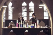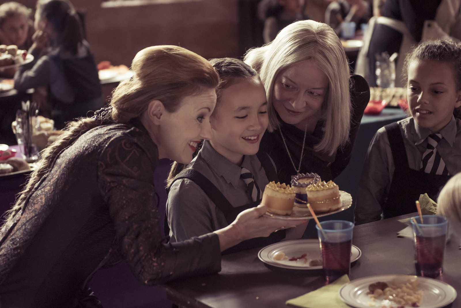 Zwillingszauber (2)Frau Galle (Kacey Ainsworth, l.) und Agatha Graustein (Clare Higgins, r.) wollen Felicitas (Dagny Rollins, 2.v.r.) zu einem Törtchen verführen. Was keiner der Schülerinnen ahnt, diese drei Törtchen sind verwandelte Mitschülerinnen.Bild: © ZDF und (c) BBC/ZDF Enterprises