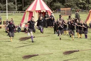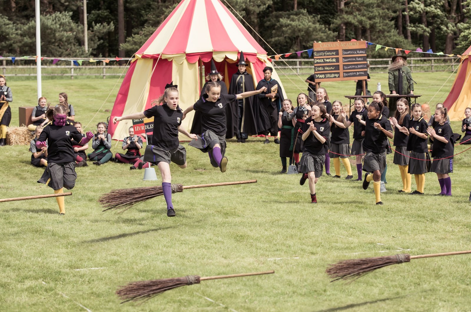 Mildreds StammbaumDas große Sportfest findet statt. Maude (Megan Hughes, l.) wollte mit Hilfe eines Zauber schwänzen, doch der ist misslungen - statt grün hat sich ihre Haut violett verfärbt. Tapfer stellt sie sich ihrer Angst vor sportlichen Wettkämpfen und läuft im Besenlauf gegen Esther (Jenny Richardson, M. l.) und Felicitas (Dagny Rollins, M. r.). Mildred (Bella Ramsey, r.) läuft nebenher und feuert Maude an.Bild: © ZDF und James Stack.