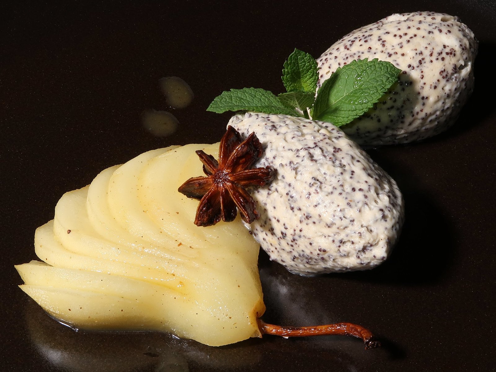 Glasierter Schweinebauch mit Bohnensalat und gekochtem Radi / Kürbis-Maultaschen mit Schmelzzwiebeln / Mohnmus mit karamellisierten BirnenMohnmousse mit karamellisierten Birnen.Bild: © BR/Jürgen Endriß