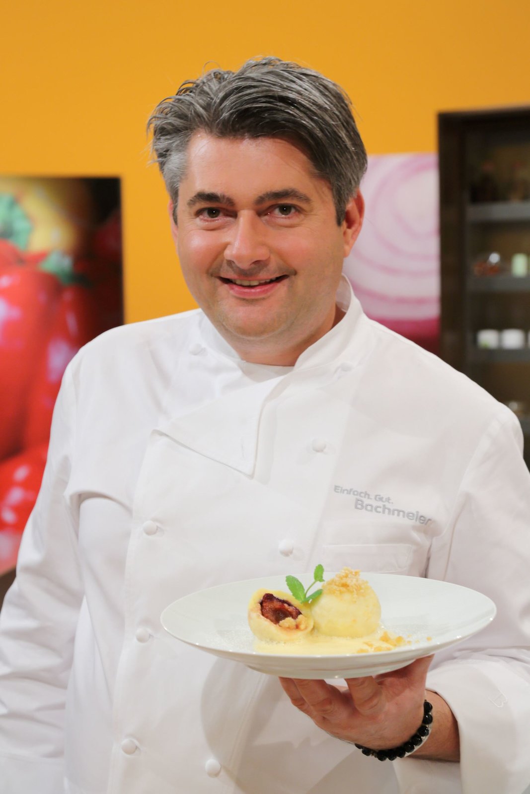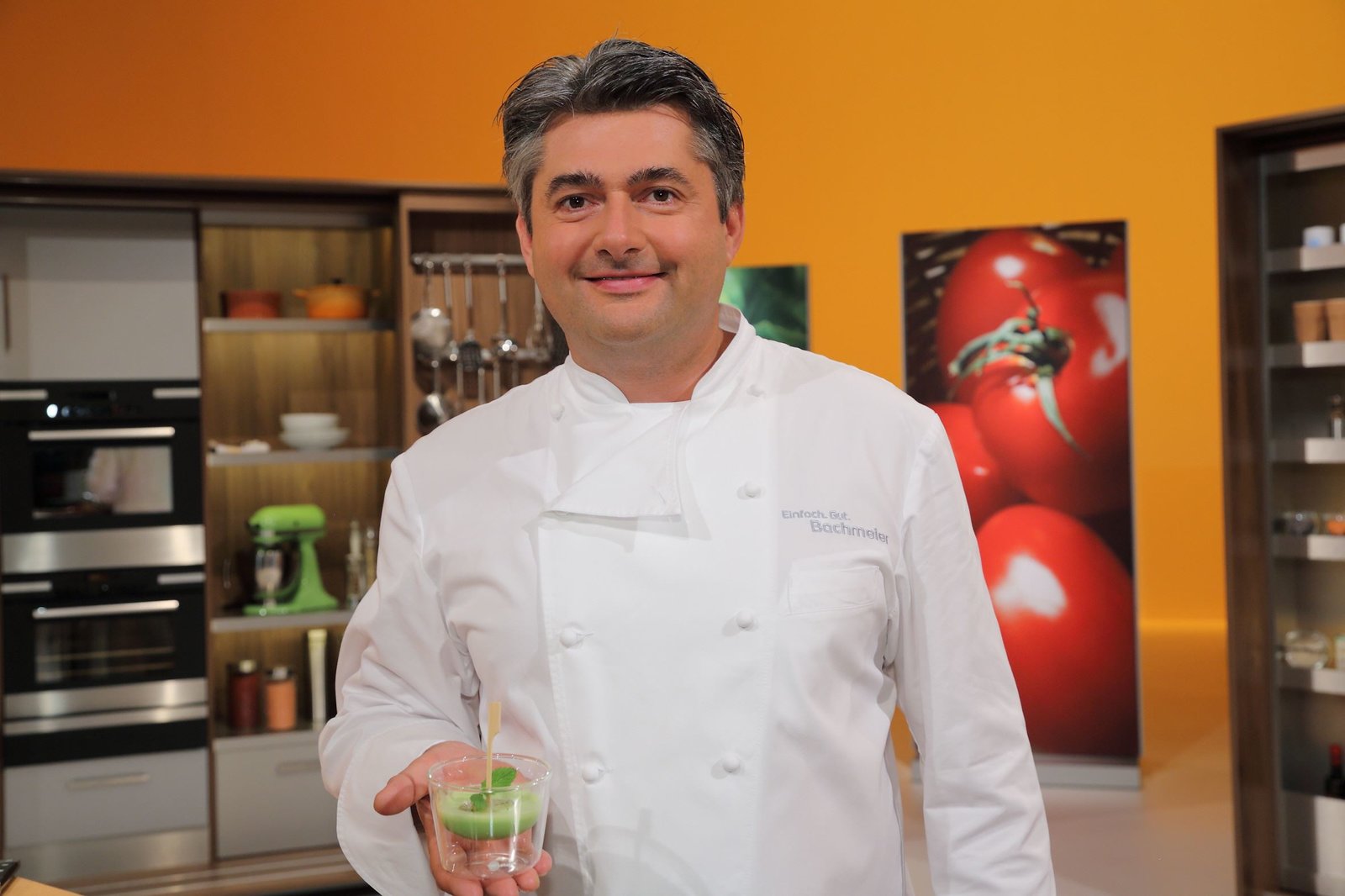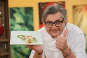 Tomatensuppe mit Quarknockerl / Gefüllte Kartoffeln mit Saibling / Topfenpfannkuchen mit ErdbeerenDer niederbayerische Spitzenkoch Hans Jörg Bachmeier.Bild: © BR/Foto Sessner