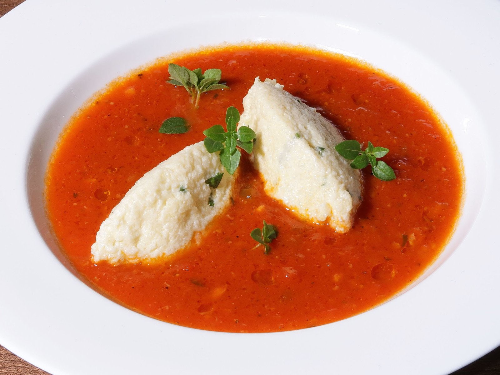 Tomatensuppe mit Quarknockerl / Gefüllte Kartoffeln mit Saibling / Topfenpfannkuchen mit ErdbeerenTomatensuppe mit Quarknockerl.Bild: © BR/Jürgen Endriß