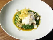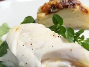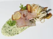 Gebackener Presssack / Zander in der Salzkruste / ZwetschgendatschiZander in der Salzkruste mit grüner Sauce und Kartoffel-Kohlrabi-Gratin.Bild: © BR/Jürgen Endriß
