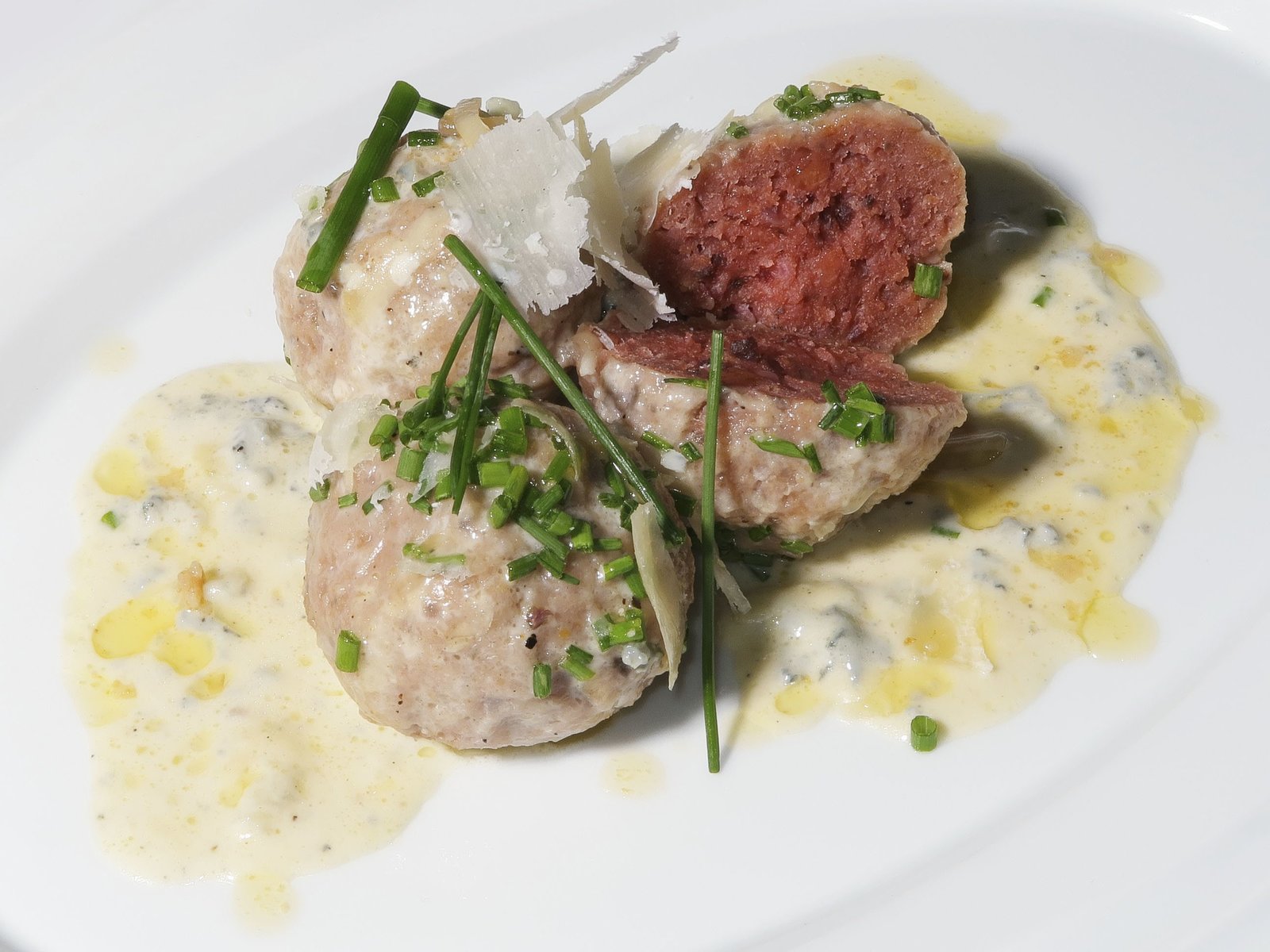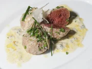 Gebeizter Huchen mit Senfkohlrabi / Rana-Knödel mit Gorgonzolasoße / Schweinefilet im BlätterteigmantelRana-Knödel mit Gorgonzolasauce.Bild: © BR/Jürgen Endriß