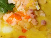 Gelbe Linsensuppe / Zitronenhendl / Gebackene GrießschnittenGelbe Linsensuppe mit Garnelen.Bild: © BR/Jürgen Endriß