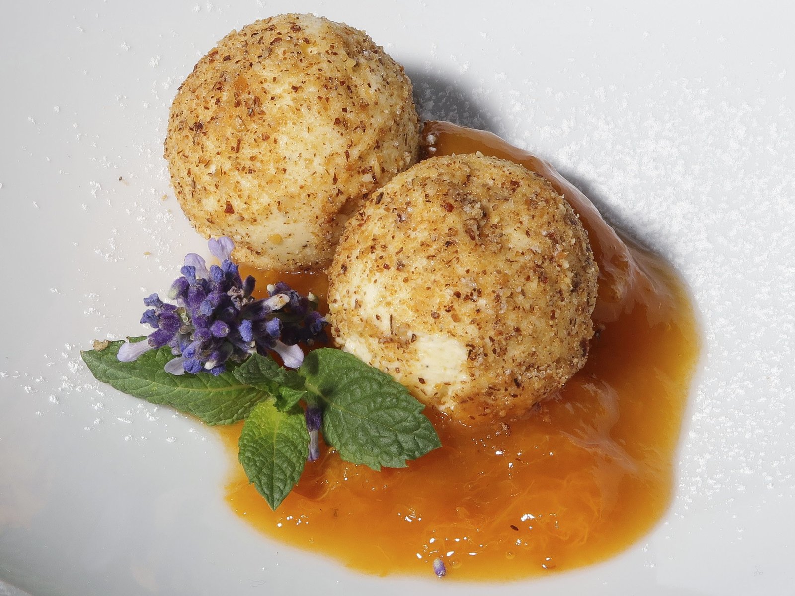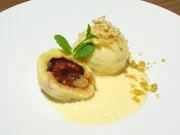 gebratene Garnele mit Apfel-Mangosalat / Schweinefilet auf Gorgonzola-Rösti / ZwetschgenknödelZwetschgenknödel.Bild: © BR/Jürgen Endriß