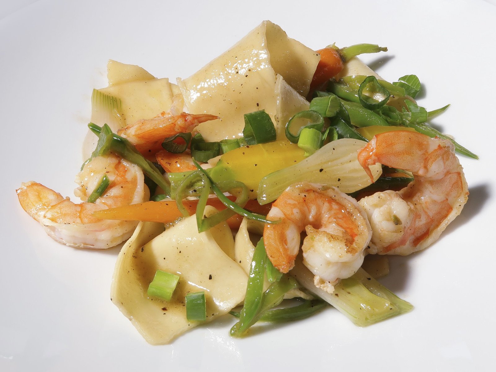 Brotsuppe mit Rindfleischcarpaccio / Nudelfleckerl mit Garnelen / Geeister Cappuccino mit Karamellkirsch-KompottNudelfleckerl mit Garnelen.Bild: © BR/Jürgen Endriß