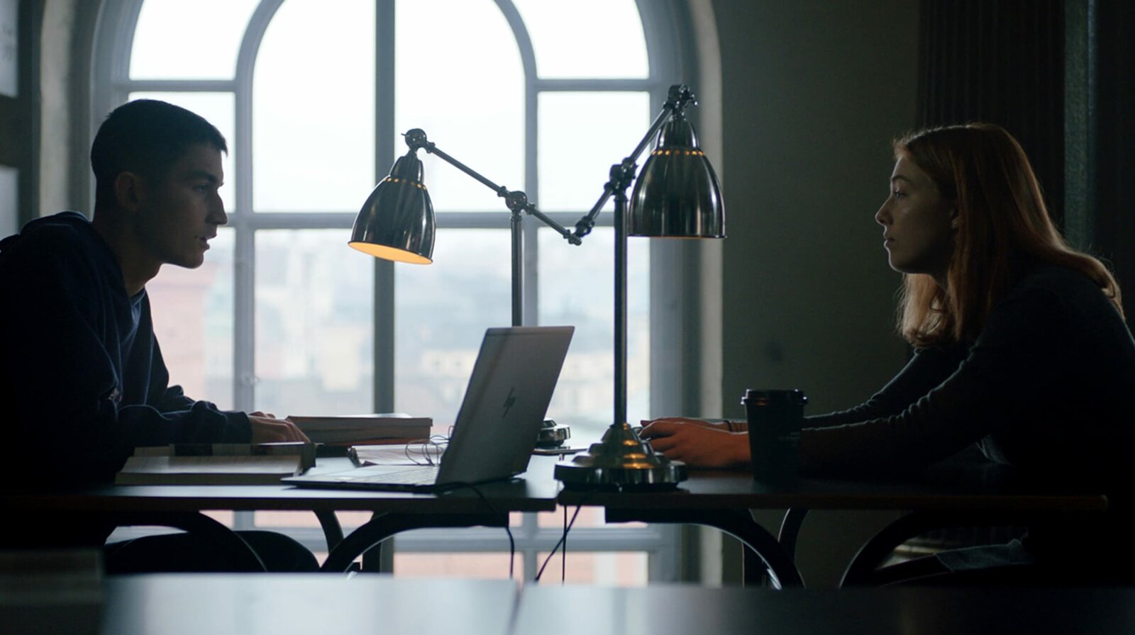 Aron (Gustav Lindh) lernt mit seiner besten Freundin Jenny (Sofia Karemyr).