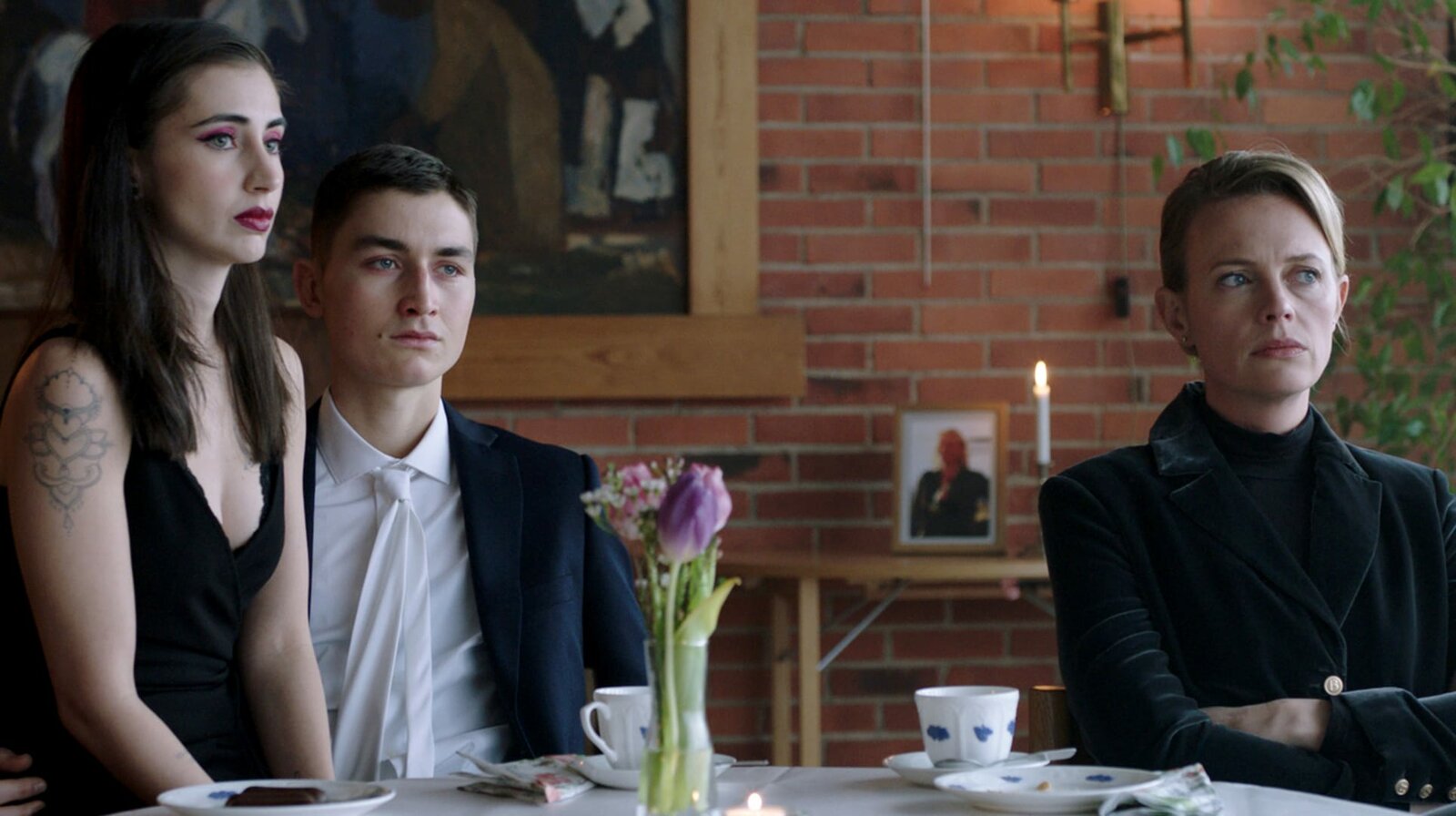 Aron (Gustav Lindh, Mitte) mit seiner Freundin Elsa (Dilan Gwyn, li.) und seiner Schwester Clara (Josephine Bornebusch, re.) auf der Beerdigung seiner Mutter.