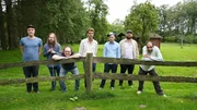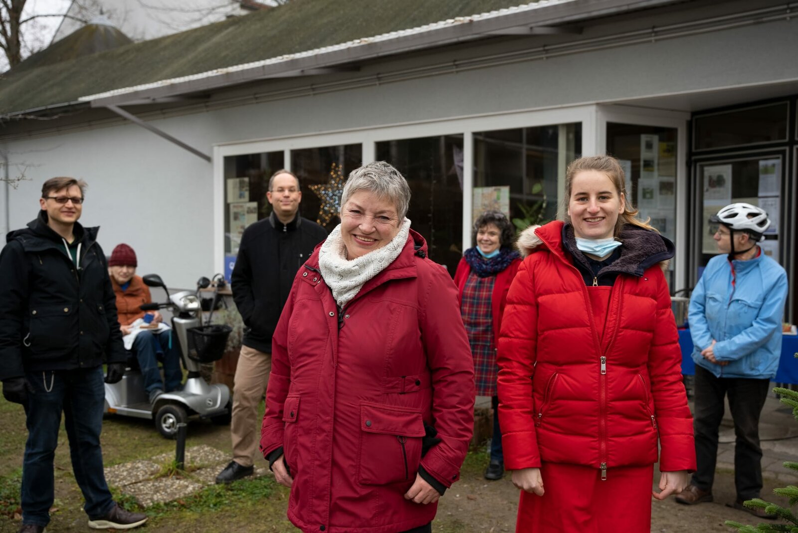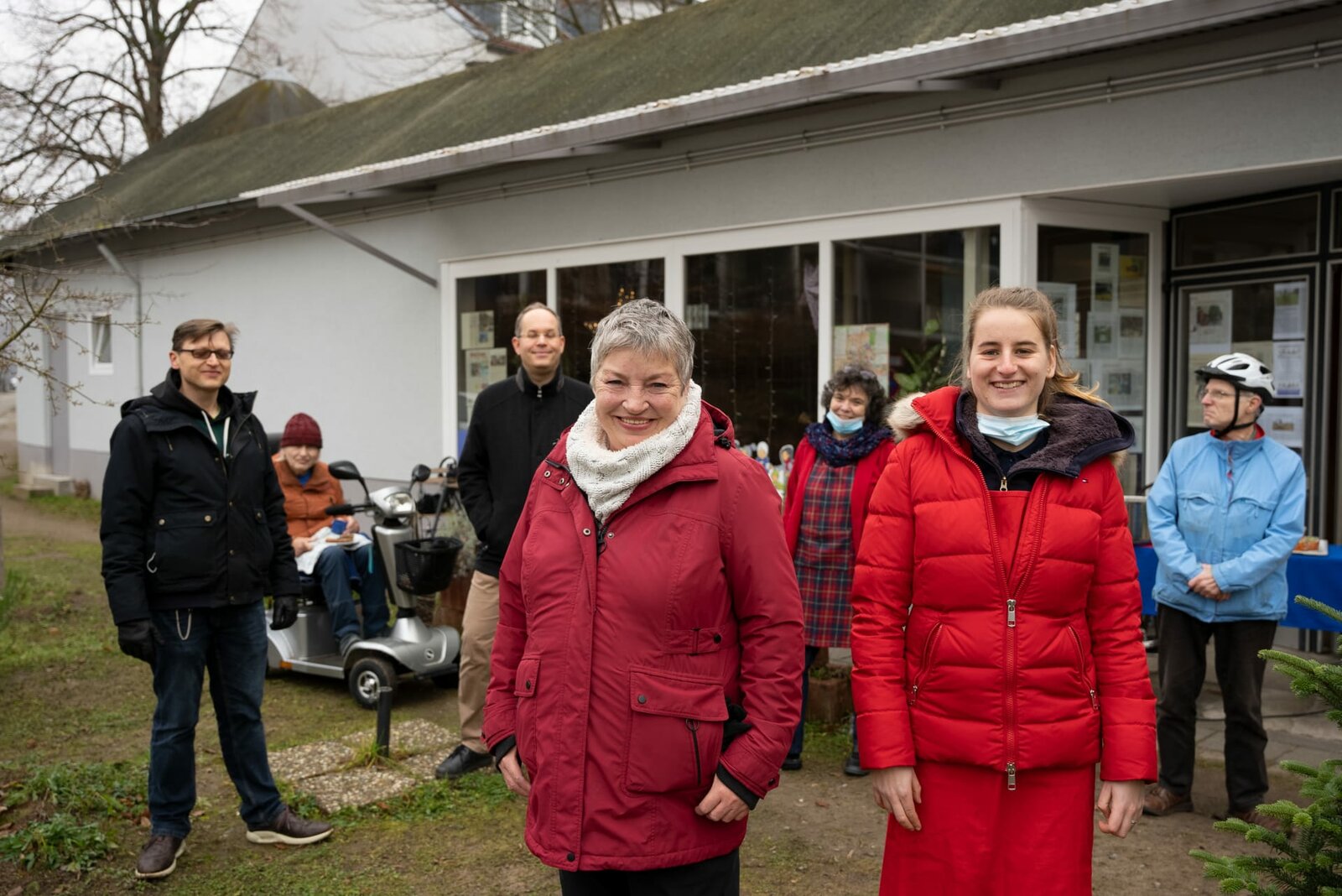 Gute Nachbarn inklusiveIn der Postsiedlung in Darmstadt ist der Zusammenhalt groß. Sigrid (l.) und Nina Hestermann (r.) können auf die Unterstützung ihrer Nachbarn bauen. Im Hintergrund stehen Stefan Reuschlein, Bastian Ripper und Ruth Schäfer.Bild: © ZDF und Christina Dierschke.