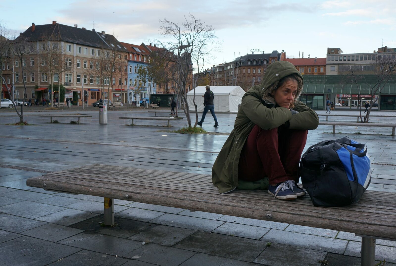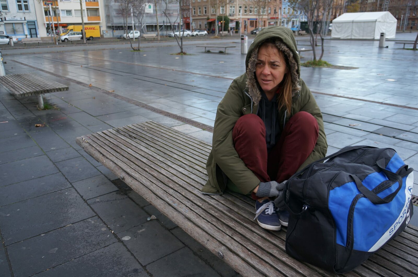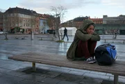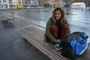 Auf der StraßeBernadette L. auf einer Bank auf dem Marktplatz der Stadt.Bild: © ZDF und Marion Mück-Raab.
