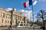 Straßburg, grenzenloser SchienenverkehrEine Straßenbahn, hier ein Citadis Triebwagen, hält am Place de la République, vor dem Staatstheater.Bild: © SWR/Ildico Wille