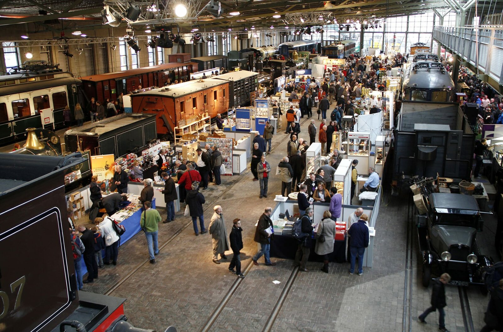 Modellbahn TraumtheaterAussicht von oben - Messestände und Modellbahn-Anlage zwischen diversen Exponaten des Niederländischen Eisenbahnmuseums in Utrecht.Bild: © SWR/Wolfgang Drichelt
