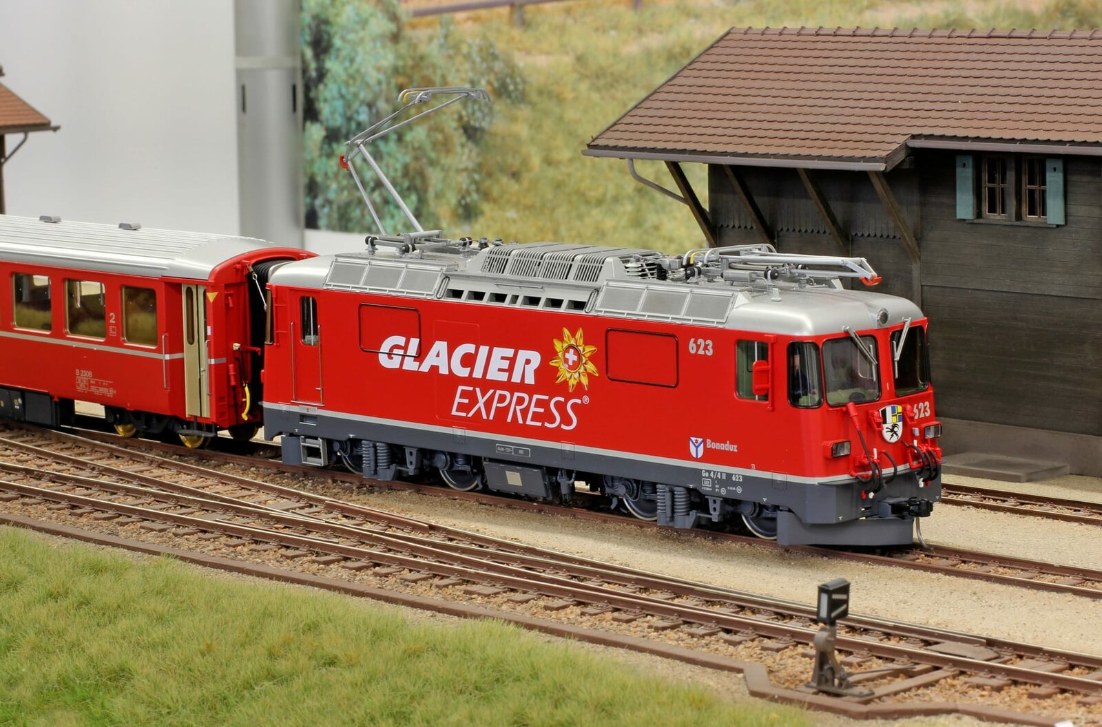 Modellbahn-Neuheiten 2022Die E-Lok Ge 4/4 II 623 der Rhätischen Bahn mit Eigenwerbung „Glacier Express".Bild: © SWR/BEMO Modelleisenbahnen GmbH