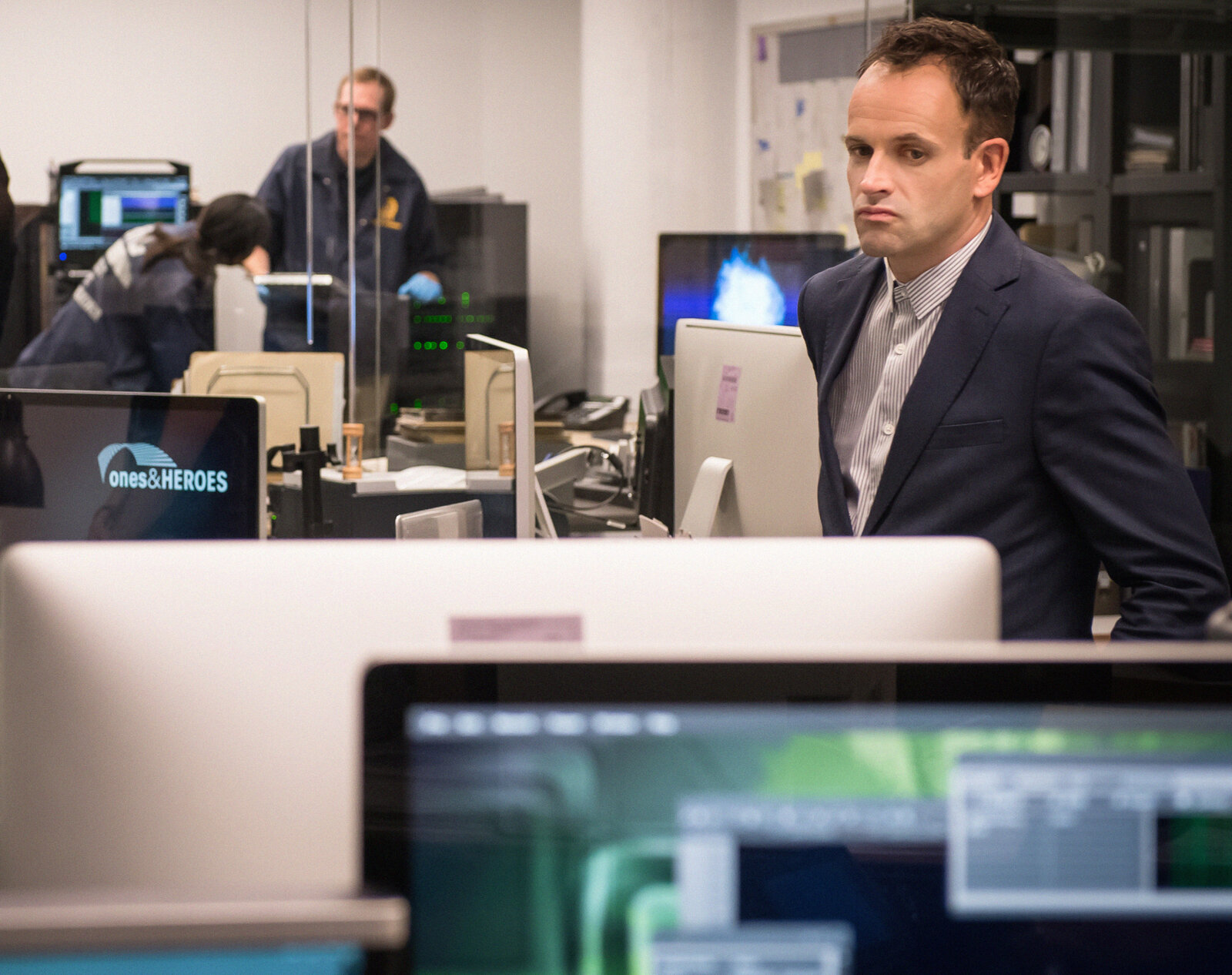 Die unsichtbare HandKurz nachdem Morland Holmes sein Büro verlassen hat, explodiert dort eine Bombe. Holmes und Watson (Lucy Liu, r.) vermuten, dass die Organisation von Moriarty dafür verantwortlich ist, verschweigen dies aber Captain Gregson (Aidan Quinn, l.) und Detective Bell (Jon Michael Hill) ...Bild: © 2016 CBS Broadcasting Inc. / Michael Parmelee