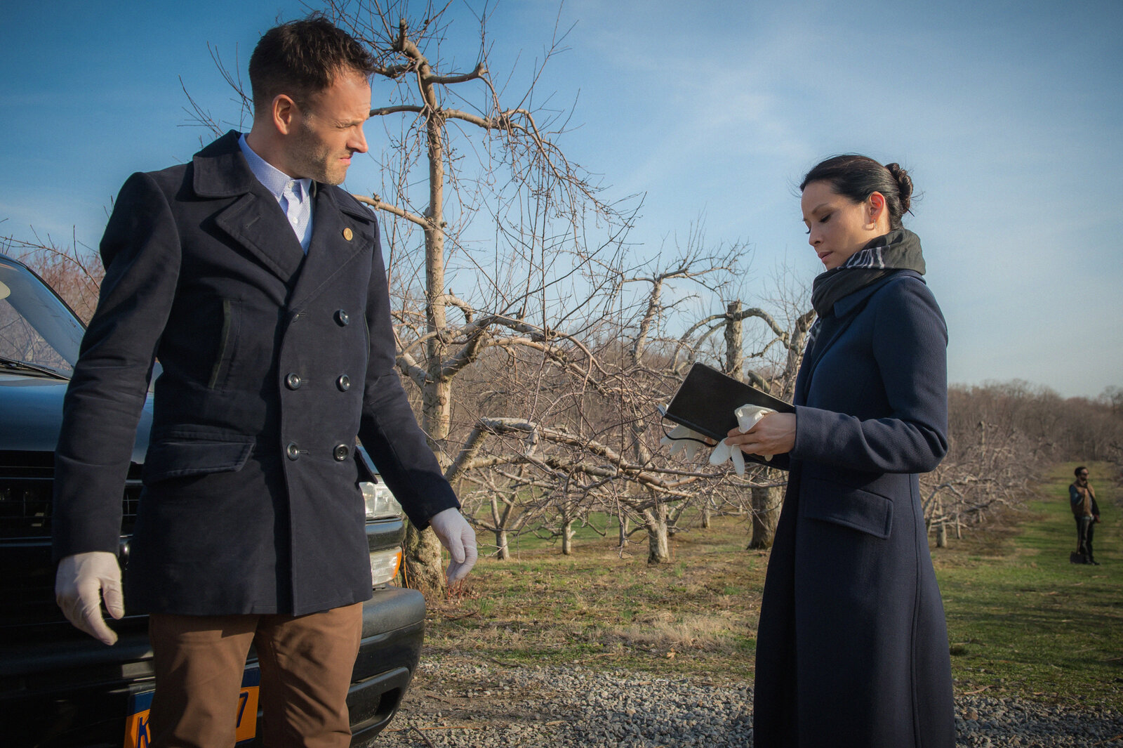 BienensterbenAls ein Mitglied aus Holmes Imker Community unter mysteriösen Umständen ums Leben kommt, schauen sich Holmes (Jonny Lee Miller, l.) und Watson (Lucy Liu, r.) den Tatort genauer an ...Bild: © CBS Television