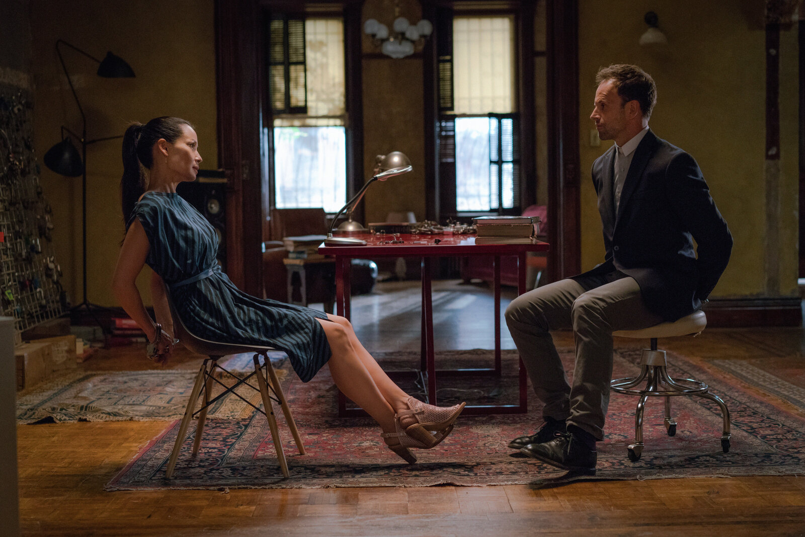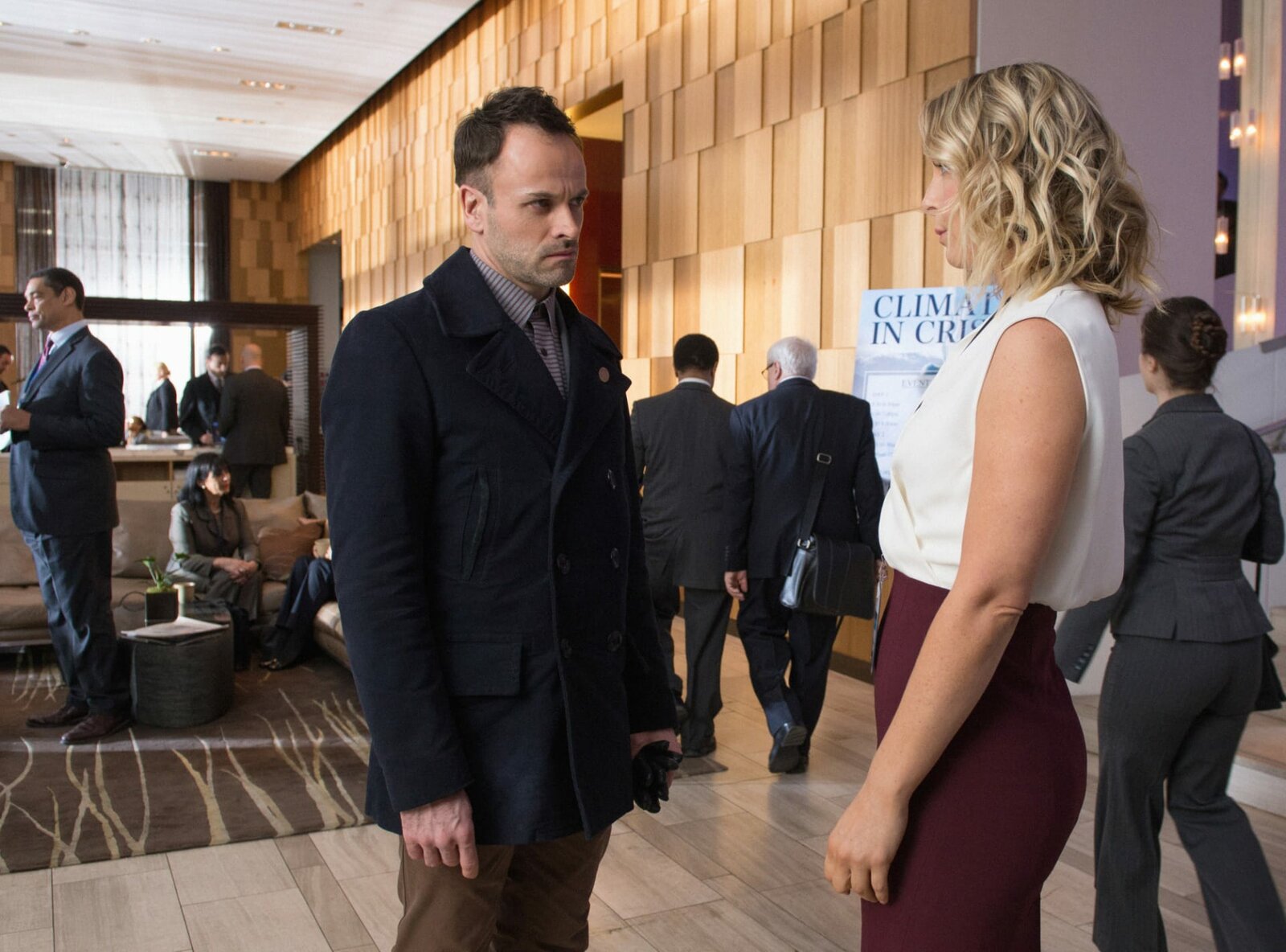 Die Aussicht vom Olympl-r: Holmes (Jonny Lee Miller) , Agatha (Anastasia Griffith)Bild: © CBS Television Lizenzbild frei